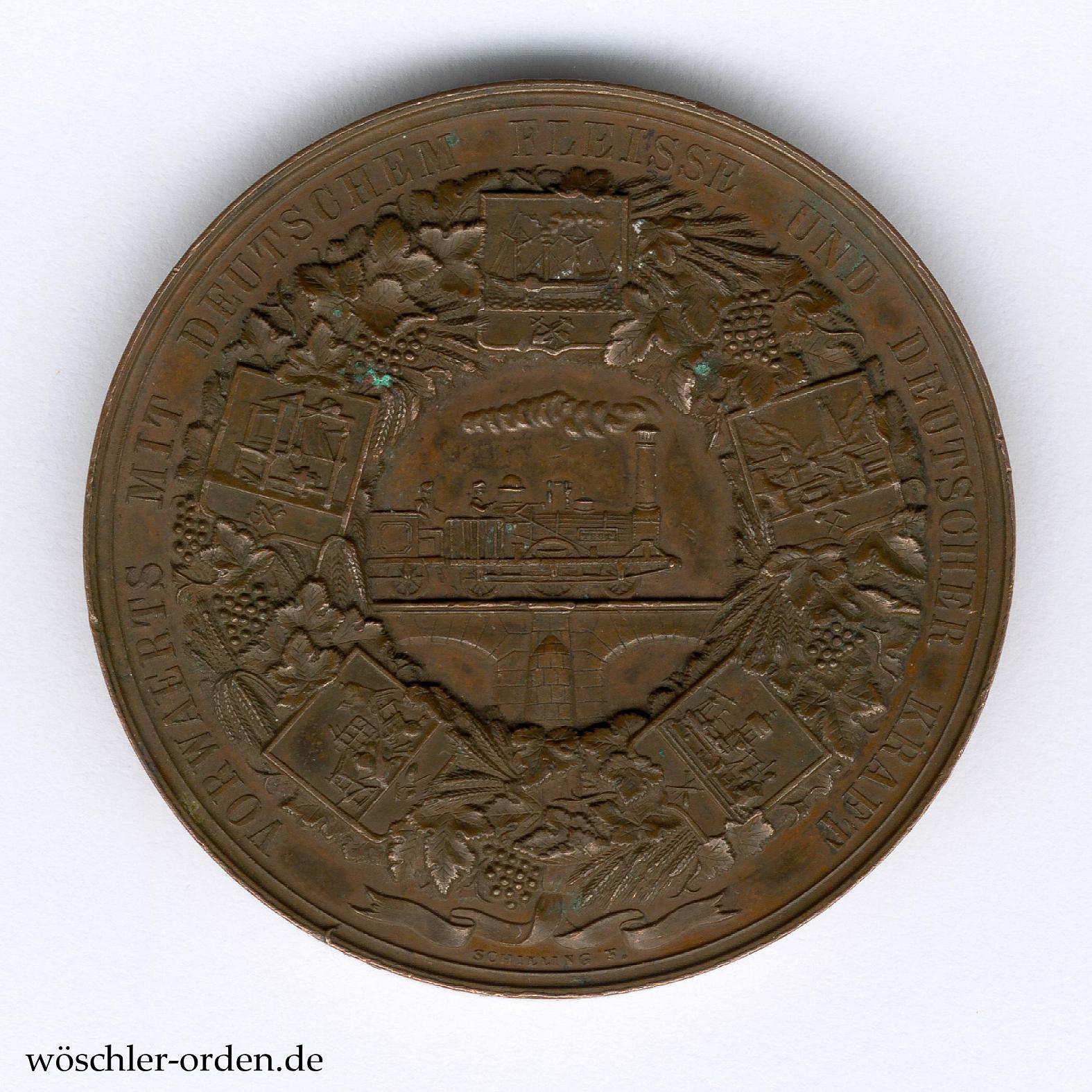 Vorderseitig sitzende Germania, rückseitig Lokomotive in Kranz mit Darstellungen aus Landwirtschaft, Textilindustrie, Schifffahrt, Bergbau und Chemie. Wurzb. 685, Marienburg 4234, Müseler 49.1.41.