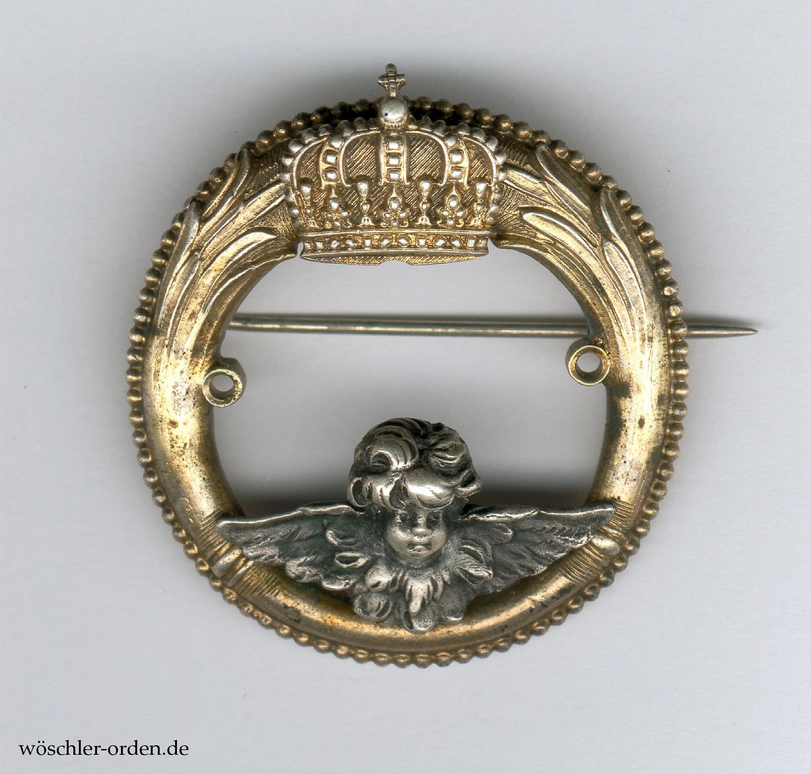 Exemplar der Ausführung mit seitwärts gestellten Flügeln des Putto, die teilweise als erste Form eingeordnet wird, in der häufigeren Version mit der preußischen Königs- bzw. Königinnenkrone. Silber teilvergoldet und -patiniert, mehrteilig gefertigt und vernietet.