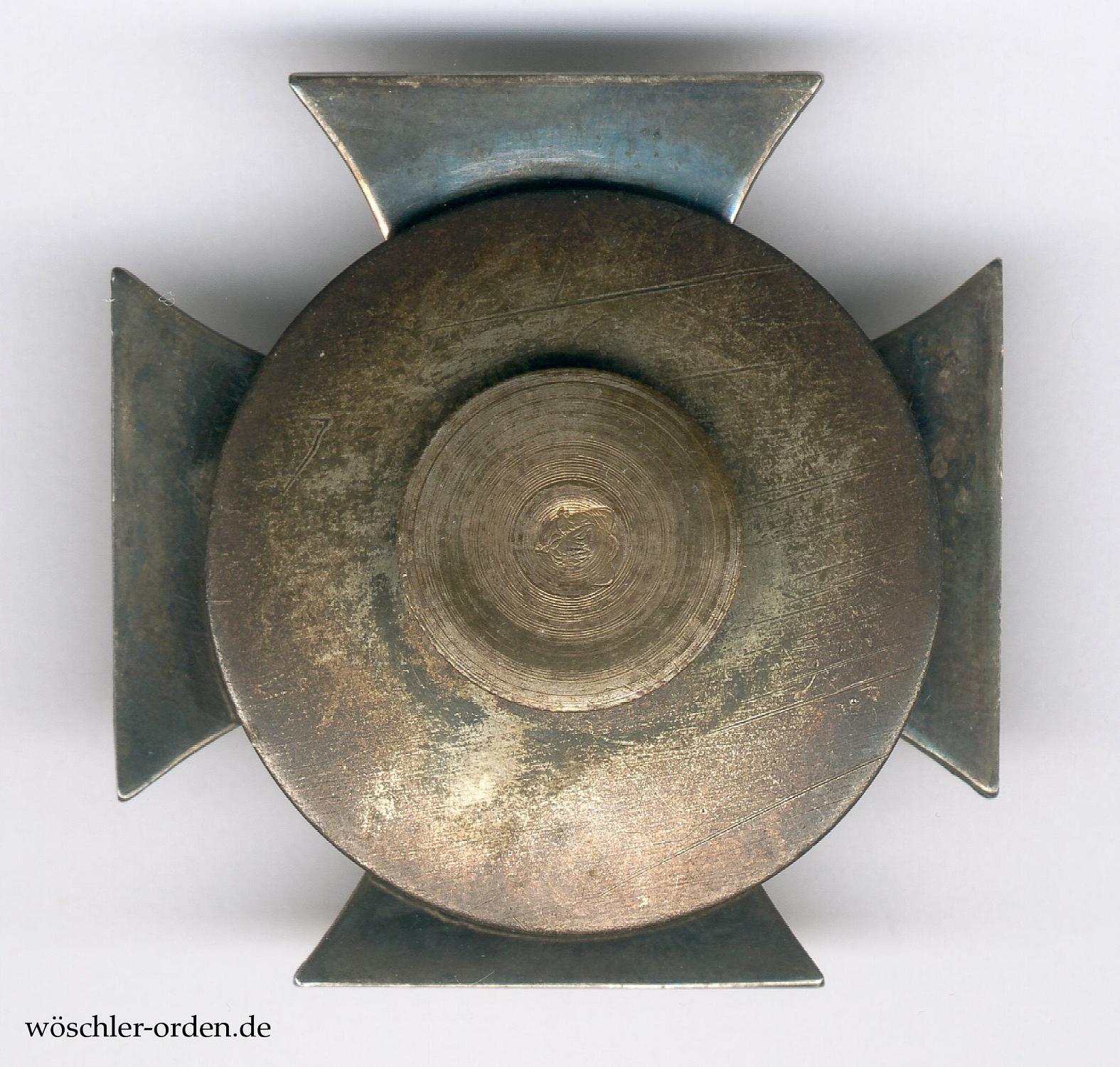 Frühe, möglicherweise noch zeitgenössische, nichtprobemäßige Zweitfertigung, mit einem aus Eisen geprägten und wohl geschwärzten Kern in Silberzarge, diese rückseitig für den Feingehalt „925“ punziert. An Schraubbefestigung mit Gegenplatte, diese Teile allesamt unpunziert. Rückseitig, auf der Befestigung, die eingeschlagene Herstellerkennzeichnung der Kunstprägeanstalt A. Werner & Söhne, Berlin (AWES- bzw. Awes-Münze, auch „AWS“) in Form eines Wappens.