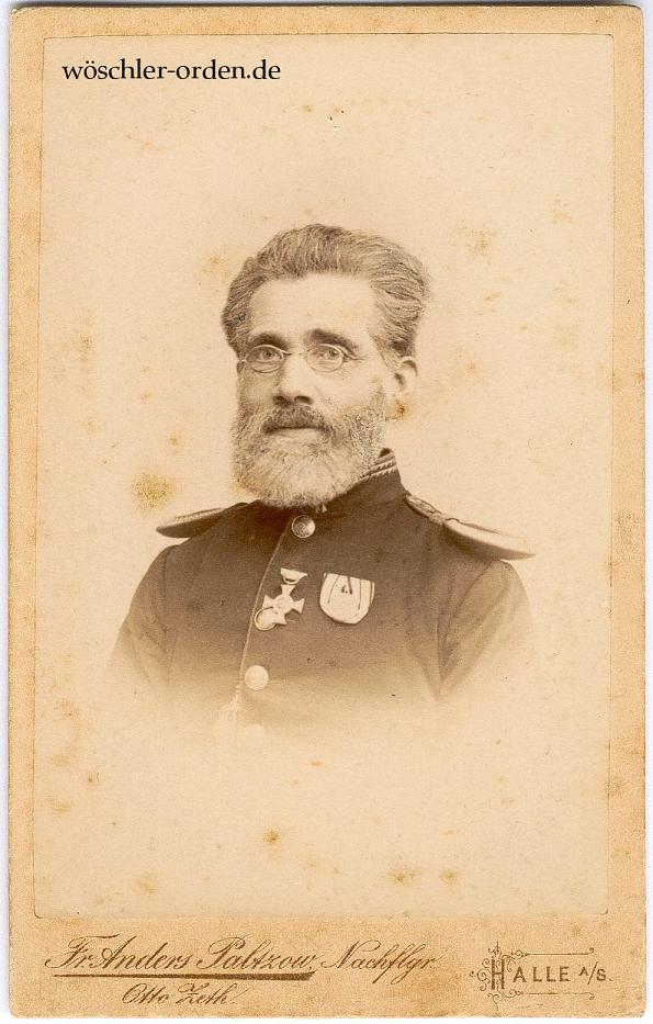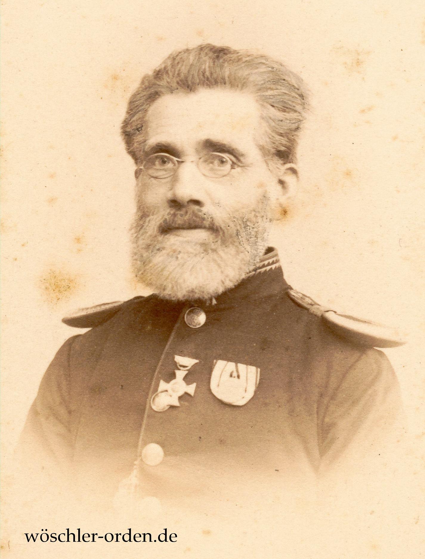 Er trägt im zweiten Knopfloch einen vermutlich frischverliehenen Königlichen Kronenorden, wohl IV. Klasse, außerdem auf der Brust die Hohenzollernsche Denkmünze 1848/1849 mutmaßlich für Kämpfer, an krauser 1er Ordensschnalle.