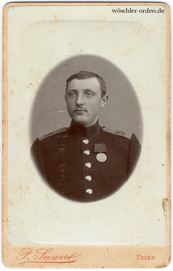 Er trägt seine einzige Auszeichnung, die „Medaille zur Erinnerung an des Hochseligen Kaisers und Königs Wilhelm I., des Großen, Majestät“, die sog. „Zentenarmedaille“, bemerkenswerterweise mit der Rückseite nach vorne, an einer trapezoid vernähten 1er Ordensschnalle.