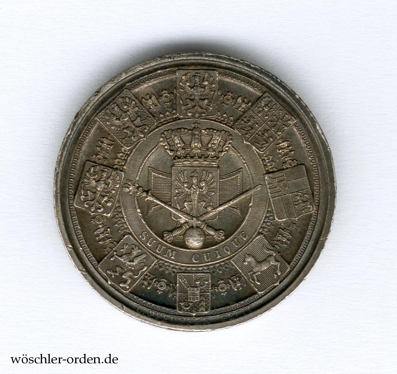 Silber, etwa 30,5 mm. Vorderseitig das nach rechts gewendete Kopfporträt König Friedrich Wilhelm IV. mit bogenförmiger Umschrift „FRIEDRICH WILHELM IV KOENIG VON PREUSSEN“. Unter dem Porträt zweizeilige, bogenförmige Umschrift „ZUR HULDIGUNG / BERLIN D. 15 OCTOBER 1840“. Im Halsabschnitt klein „K. FISCHER F.“ Rückseitig gekrönter Wappenschild mit dem preußischen Adler über einem fast verdeckten Eisernen Kreuz, darunter Zepter und Schwert, über dem Reichsapfel gekreuzt. Um den Schild ein Ring mit der Inschrift „SUUM CUIQUE“ im unteren Teil. Der Ring umgeben von der Kette des Hohen Ordens vom Schwarzen Adler mit acht Wappenschildern der Provinzen. Unten klein „C. PFEUFFER FEC.“ Referenz: Hüsken 7.176.