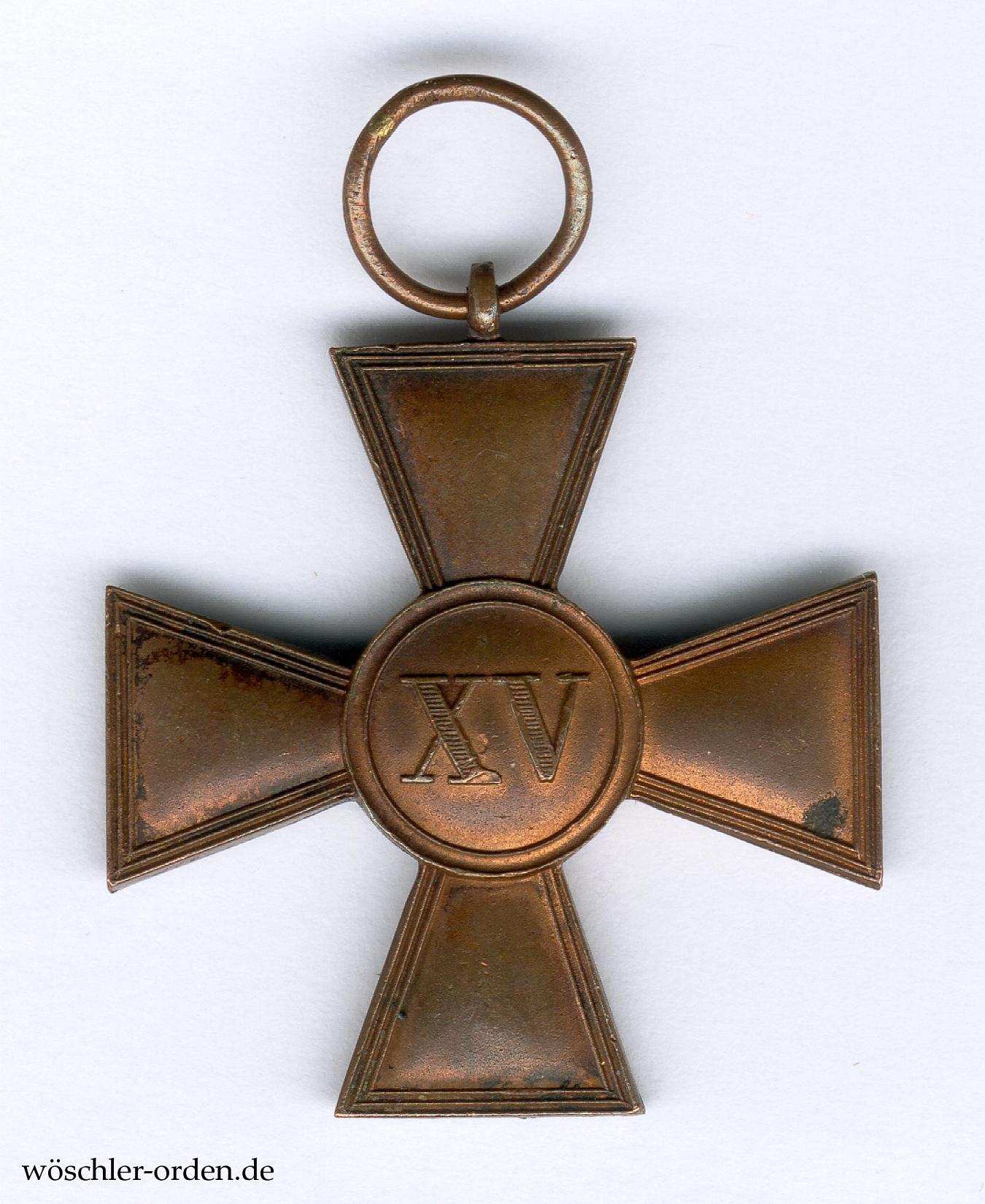 Exemplar des zweiten, ab 1913 verliehenen Modells, des Kreuzes für fünfzehn Dienstjahre. Wohl Kupfer geprägt und bronziert, an angelöteter Ringöse mit geschlossenem Bandring.