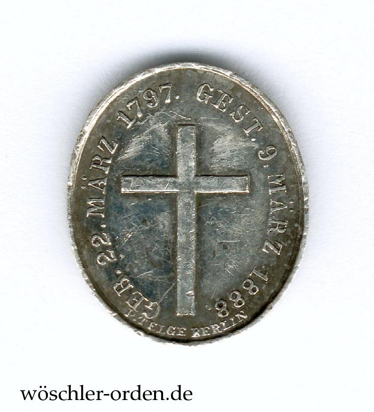 Silber, etwa 19 mm x 16 mm. Vorderseitig Portrait nach rechts, mit Umschrift „WILHELM DEUTSCHER KAISER KÖNIG VON PREUSSEN“. Unter dem Halsabschnitt Signatur „P. TELGE“ wohl des bekannten Kunsthandwerkers und Königlich Rumänischen Hofjuweliers und Hofgoldschmieds Paul Telge (um 1850 - 1909). Rückseitig Kreuz mit Umschrift „GEB. 22. MÄRZ 1797. GEST. 9. MÄRZ 1888.“, darunter Signatur „P. TELGE BERLIN“.