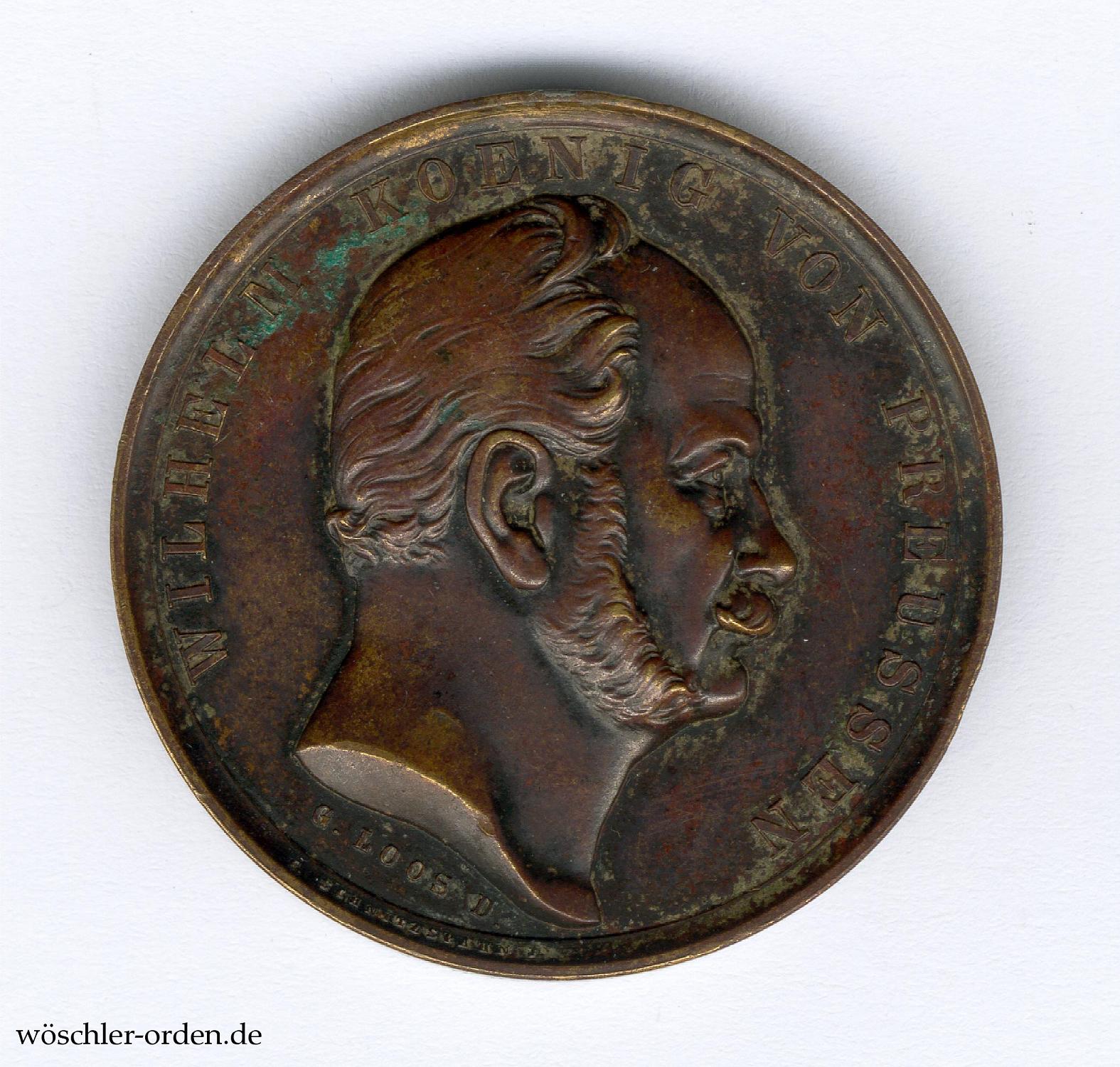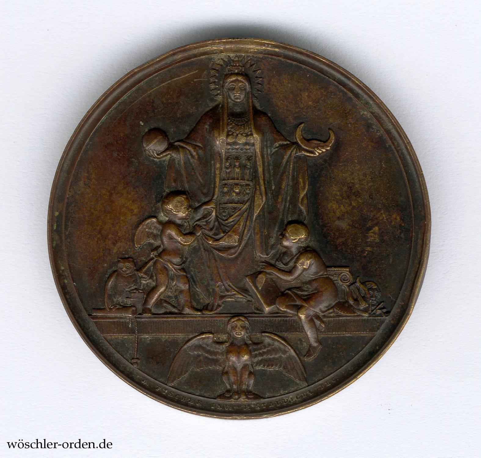 Abschlag der mutmaßlich nur in Gold verliehenen Medaille. Bronze oder Kupfer geprägt und patiniert, vorderseitig das Portrait Wilhelm I. nach rechts, unter dem Halsabschnitt „G. LOOS D.“, Signatur „C. SCHNITZSPAHN F.“ auf dem Rand. Rückseitig Darstellung der Artemis (oder der „personifizierten Altertumskunde“?) mit Mondsichel, zu ihren Füßen ein Putto und ein lernender Knabe, darum verschiedene Altertümer. Signatur „A. FISCHER INV. F. STAUDIGEL FEC.“ am unteren Rand.