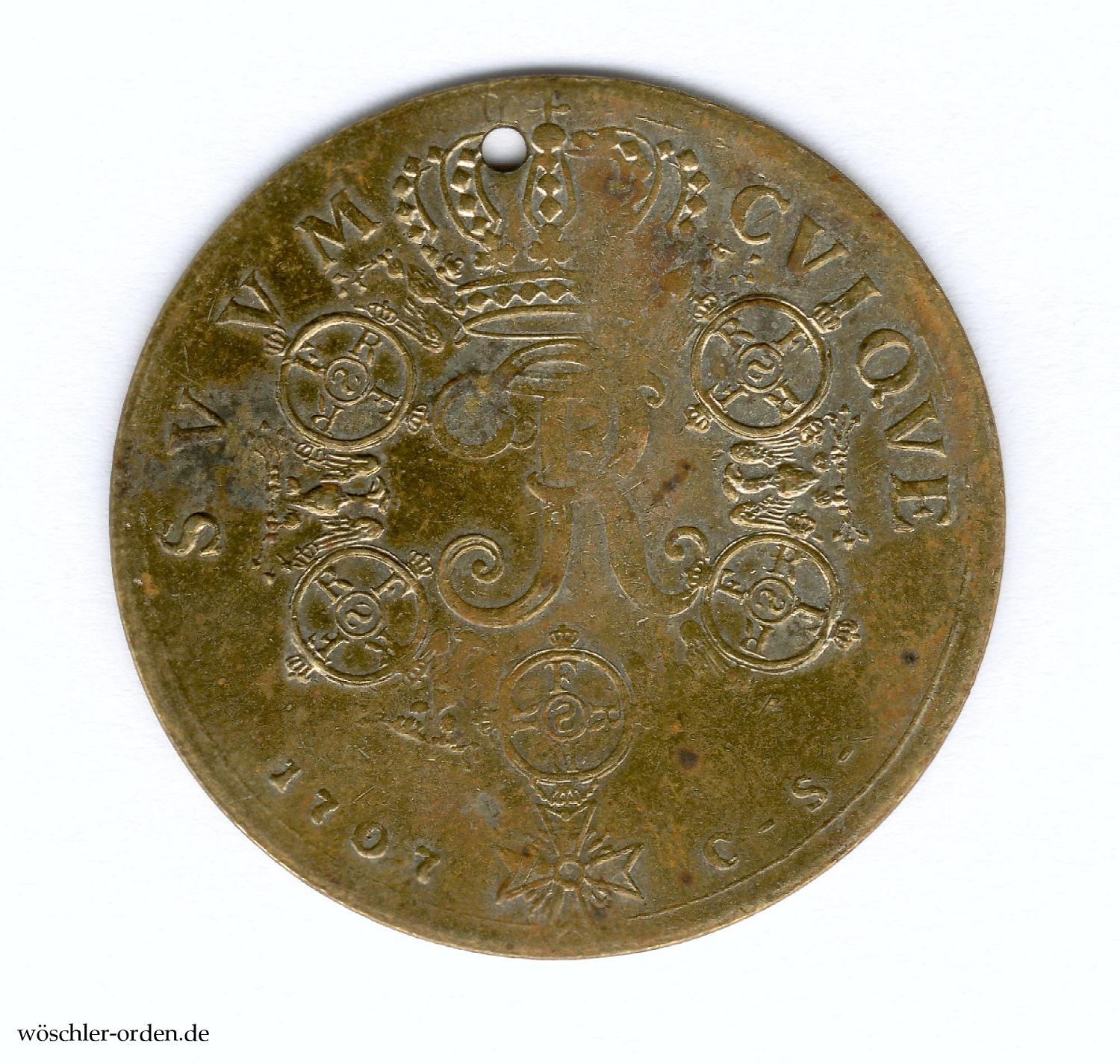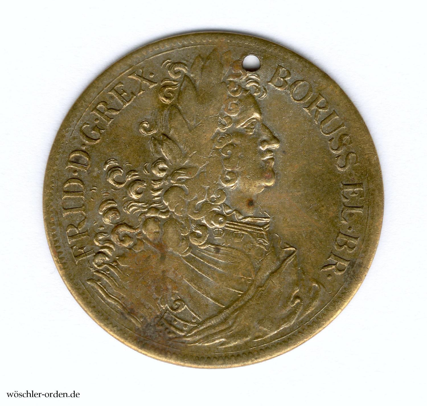 Bronze oder Messing geprägt und versilbert, vorderseitig das belorbeerte Portrait nach rechts mit Umschrift „FRID D G REX BORUSS EL BR“, rückseitig bekröntes Monogramm „FR“, darum die Kette des Hohen Ordens vom Schwarzen Adler, mit Umschrift „SVVM CVIQUE“, „1707“ und „C S“. Der Schrötling hier bloß etwa 1,1 mm stark. Am oberen Ende gelocht.
