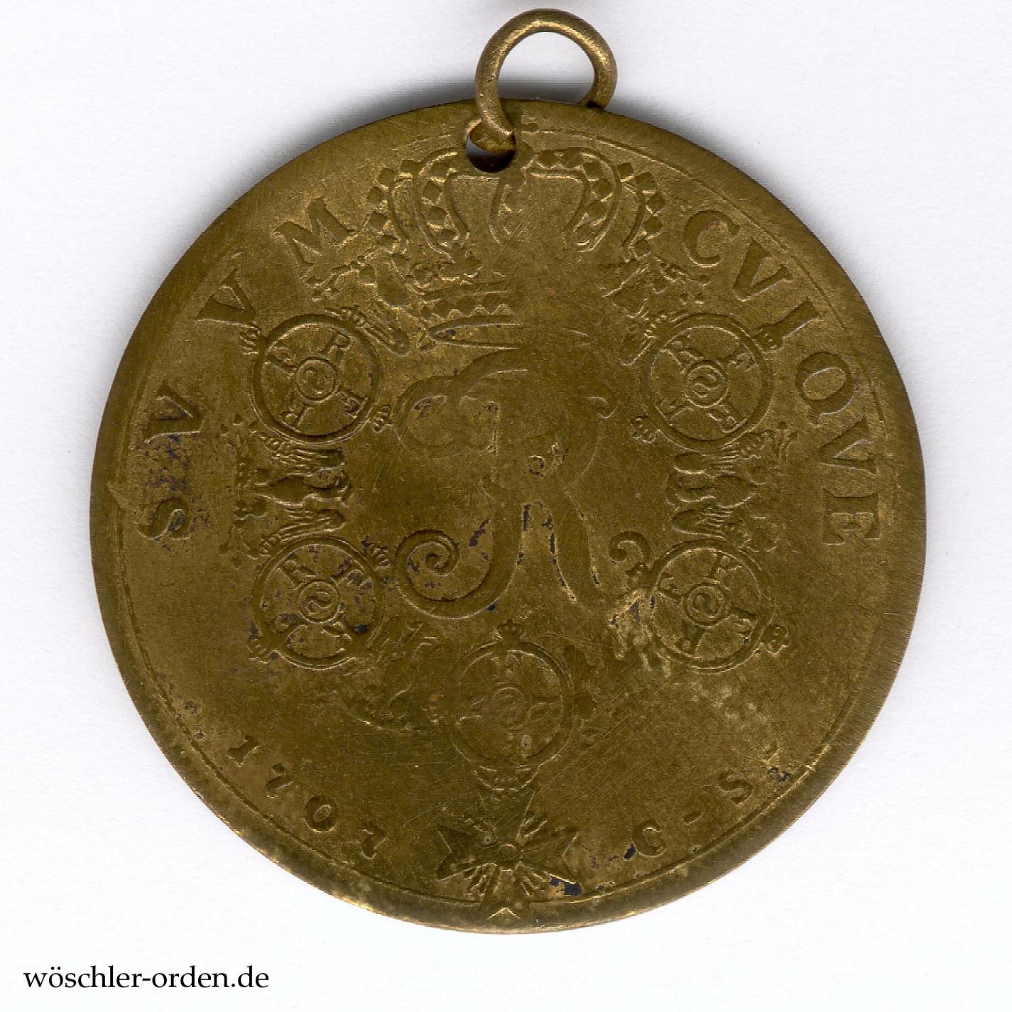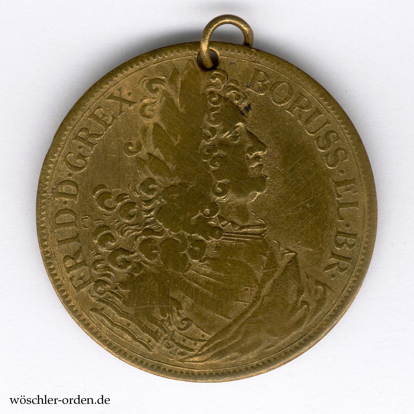 Bronze oder Messing geprägt und vergoldet, vorderseitig das belorbeerte Portrait nach rechts mit Umschrift „FRID D G REX BORUSS EL BR“, rückseitig bekröntes Monogramm „FR“, darum die Kette des Hohen Ordens vom Schwarzen Adler, mit Umschrift „SVVM CVIQUE“, „1707“ und „C S“. Exemplar auf besonders dünnem Schrötling. Am oberen Ende gelocht, durch das Loch ein einfaches, verbogenes Ringchen.