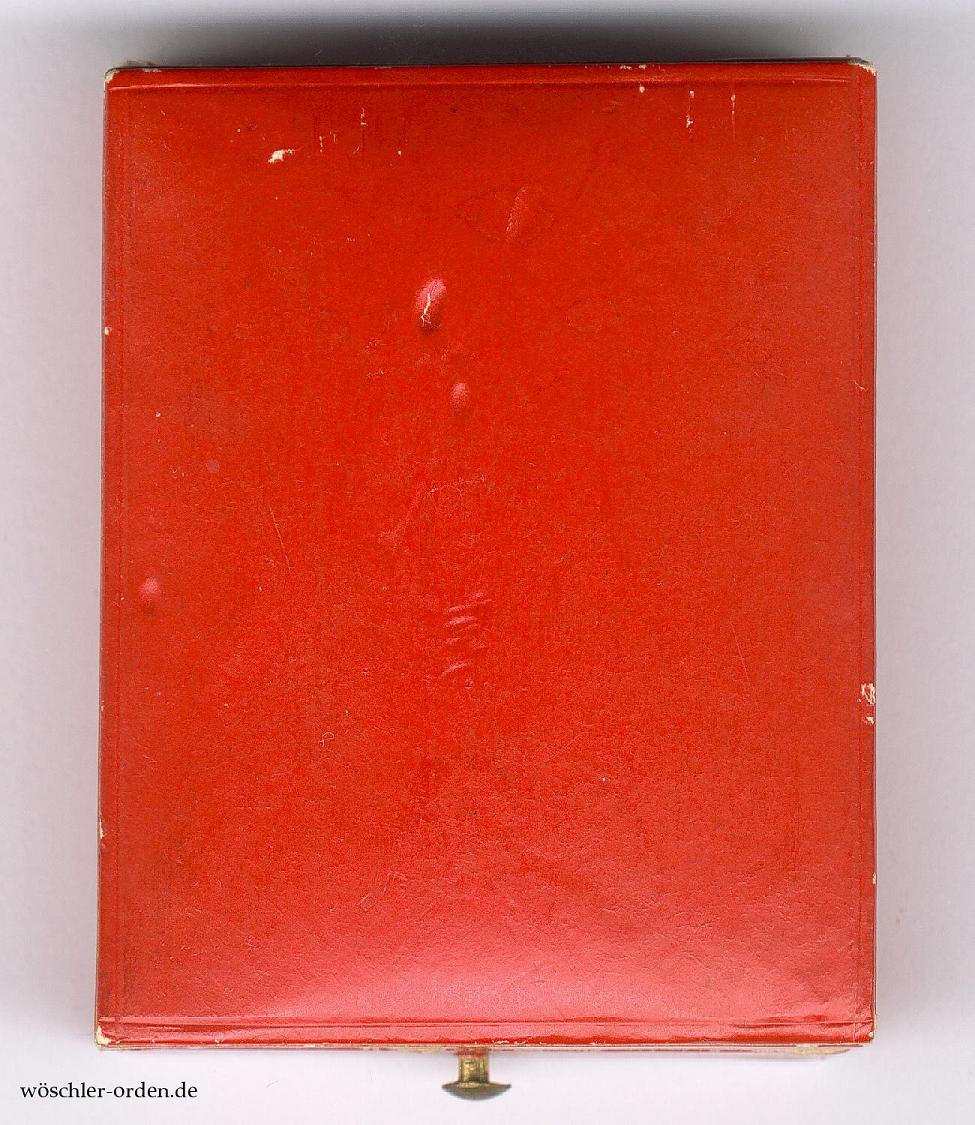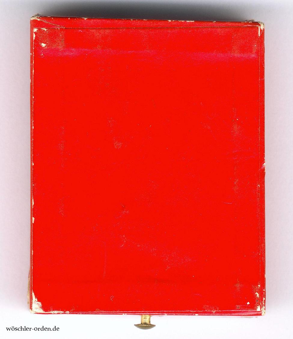 Dazu das schmucklose, rote Verleihungsetui aus Fertigung des Hofbuchbinders H. F. Schwartz, Berlin, in einer wohl mittleren Kriegsfertigung zwar noch mit goldener Zierleiste, aber bereits papierbezogen, mit samtener Einlage und seidener Auskleidung des Deckels.