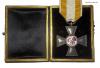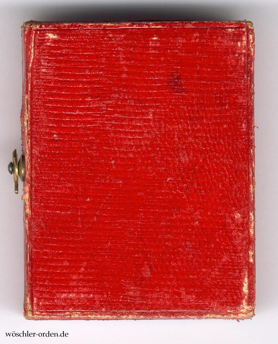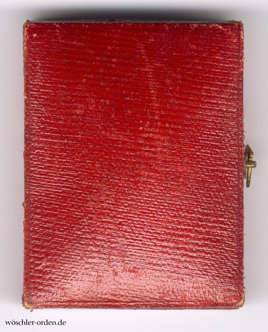 Dazu das zeitlich passende Verleihungsetui aus Fertigung der Firma H. F. Schwartz, Berlin, in echtem Maroquinleder und mit Häckchenverschluss, innen in schwarzem Samt und schwarzer Seide, die inneren Kanten mit goldenen Zierleisten beklebt.