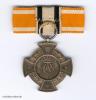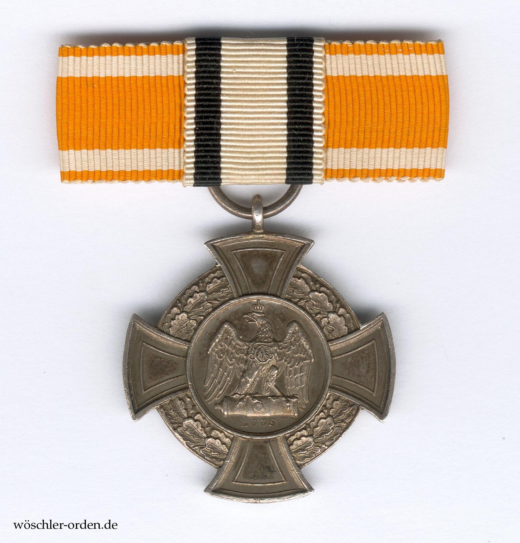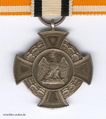 Silber geprägt, an einfacher, angelöteter Ringöse mit geschlossenem Bandring. Gestalterisch lehnt sich dieses Erinnerungskreuz an den erst ein Jahr zuvor unter die Königlich Preußischen Ordensauszeichnungen übernommenen Königlichen Hausorden von Hohenzollern an. An zu einer einfachen Schleife geformten orange-weißem und weiß-schwarzem Miniaturband.