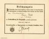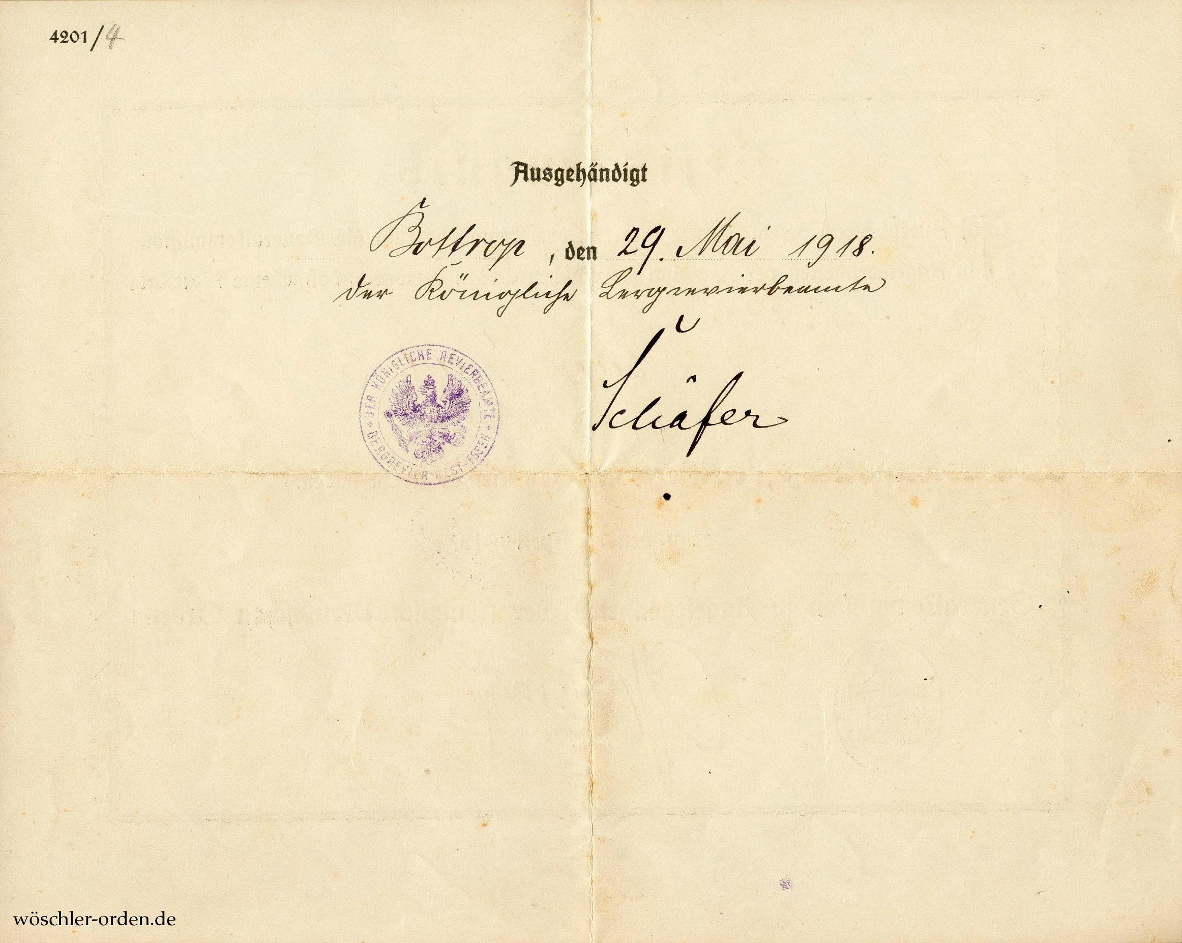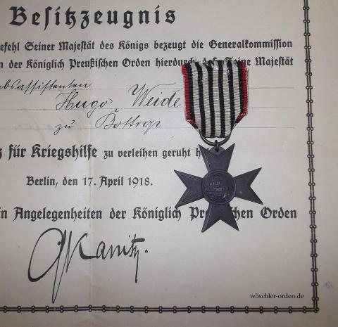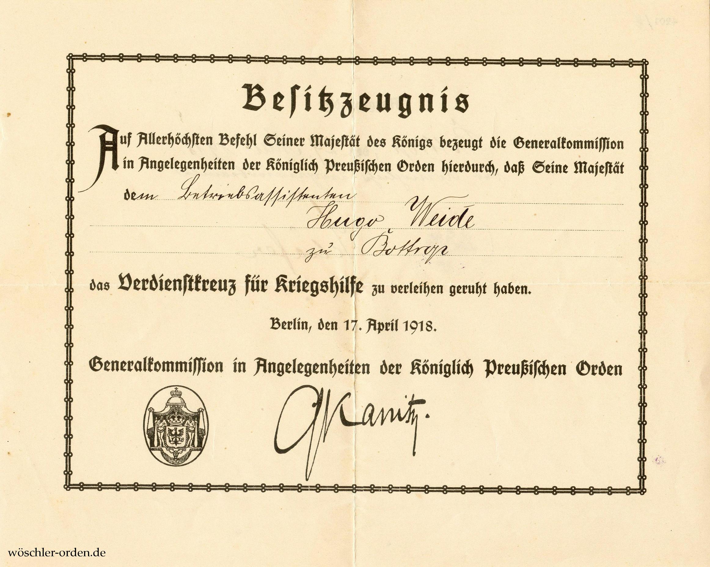 Dazu das Besitzzeugnis für den Betriebsassistenten Hugo Weide zu Bottrop. Einfaches Blatt, querformatig, beidseitig bedruckt und ausgefüllt, sowohl das Siegel und die Unterschrift des Grafen Kanitz als Stellvertreter des damaligen Präses der Generalordenskommission General der Infanterie v. Jacobi als auch das Verleihungsdatum „17. April 1918“ bereits vorgedruckt. Rückseitig Aushändigungsvermerk des Königlichen Bergrevierbeamten Schäfer zu Bottrop, vom 29. Mai 1918.