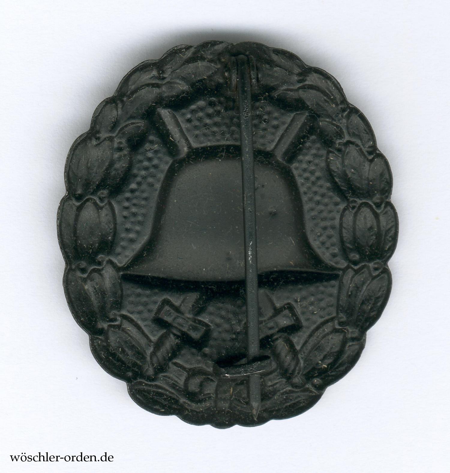 Mutmaßliches Zweitstück, Eisenblech hohlgeprägt und schwarz lackiert, rückseitig ebenfalls stählernes Nadelsystem mit runder, dünner Tragenadel. Ohne eine Herstellerkennzeichnung. Ungewöhnlich leichte Fertigung, mit flachem Relief und aus recht dünnem Blech.
