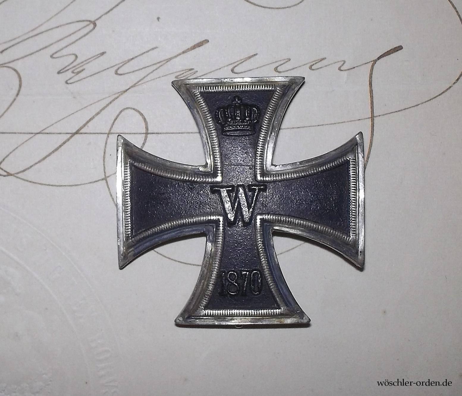 Das Eiserne Kreuz wurde durch König Wilhelm I. wenige Tage nach der Kriegserklärung Frankreichs an Preußen vom 19. Juli 1870 für den Deutsch-Französischen Krieg erneuert, der Erlass später auf den Tag der Kriegserklärung rückdatiert. In der ersten Klasse erfolgten, mit der zweiten Klasse am schwarz-weißen und jener am weiß-schwarzen Band, insgesamt etwa 1300 Verleihungen.