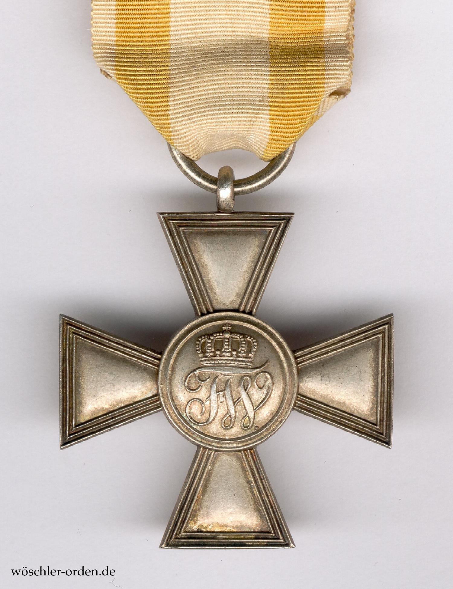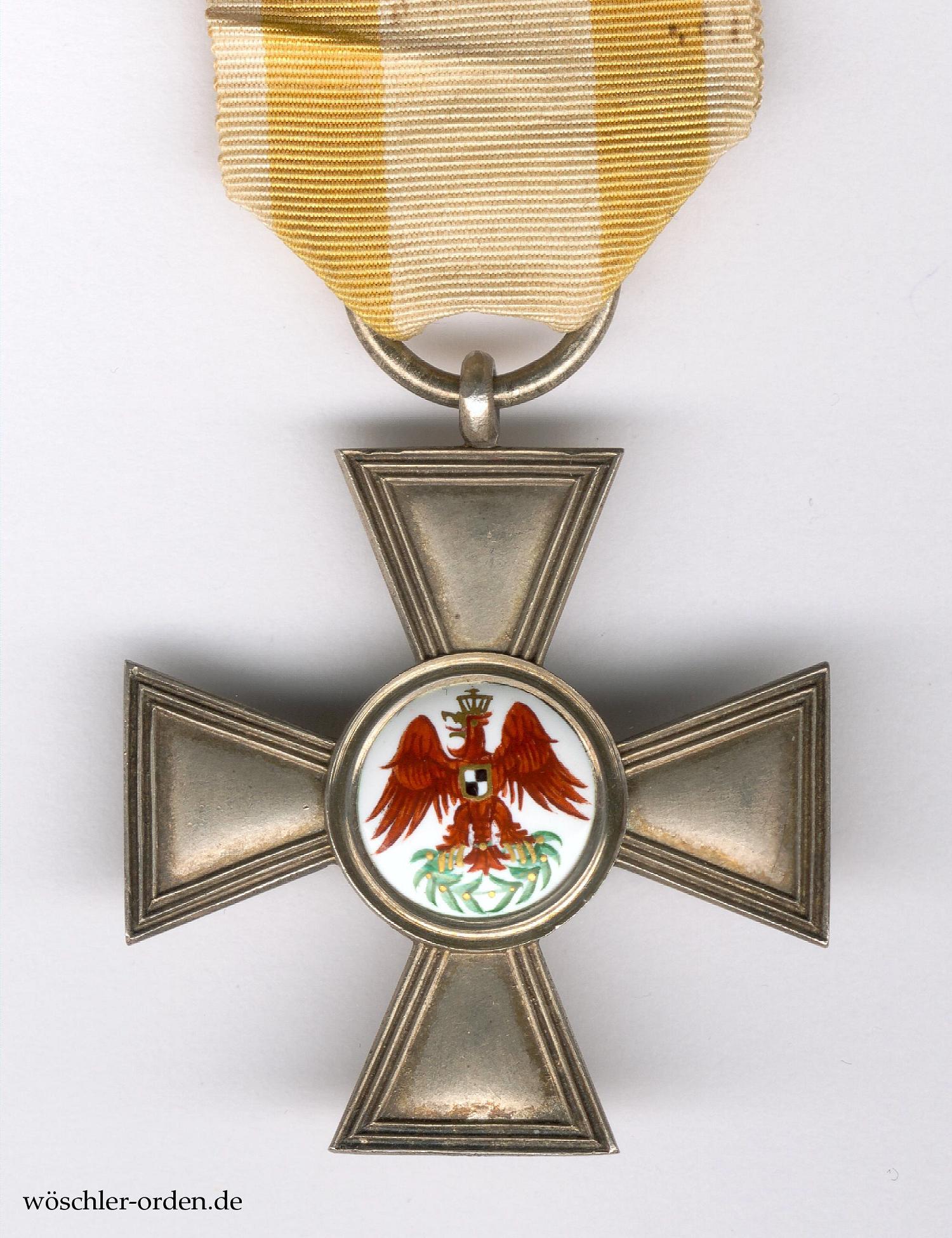 Exemplar aus der Zeit des fünften und endgültigen, ab 1854 verliehenen Modells mit der ziegelroten Adlermalerei, in der ersten, bis 1885 verliehenen Ausgabe mit den glatten Flächen der Kreuzarme. Silber, das Medaillon emailliert. An der Kante des unteren Kreuzarmes die Ritzmarke „W“ der Hofjuweliere Johann Wagner & Sohn, Berlin.