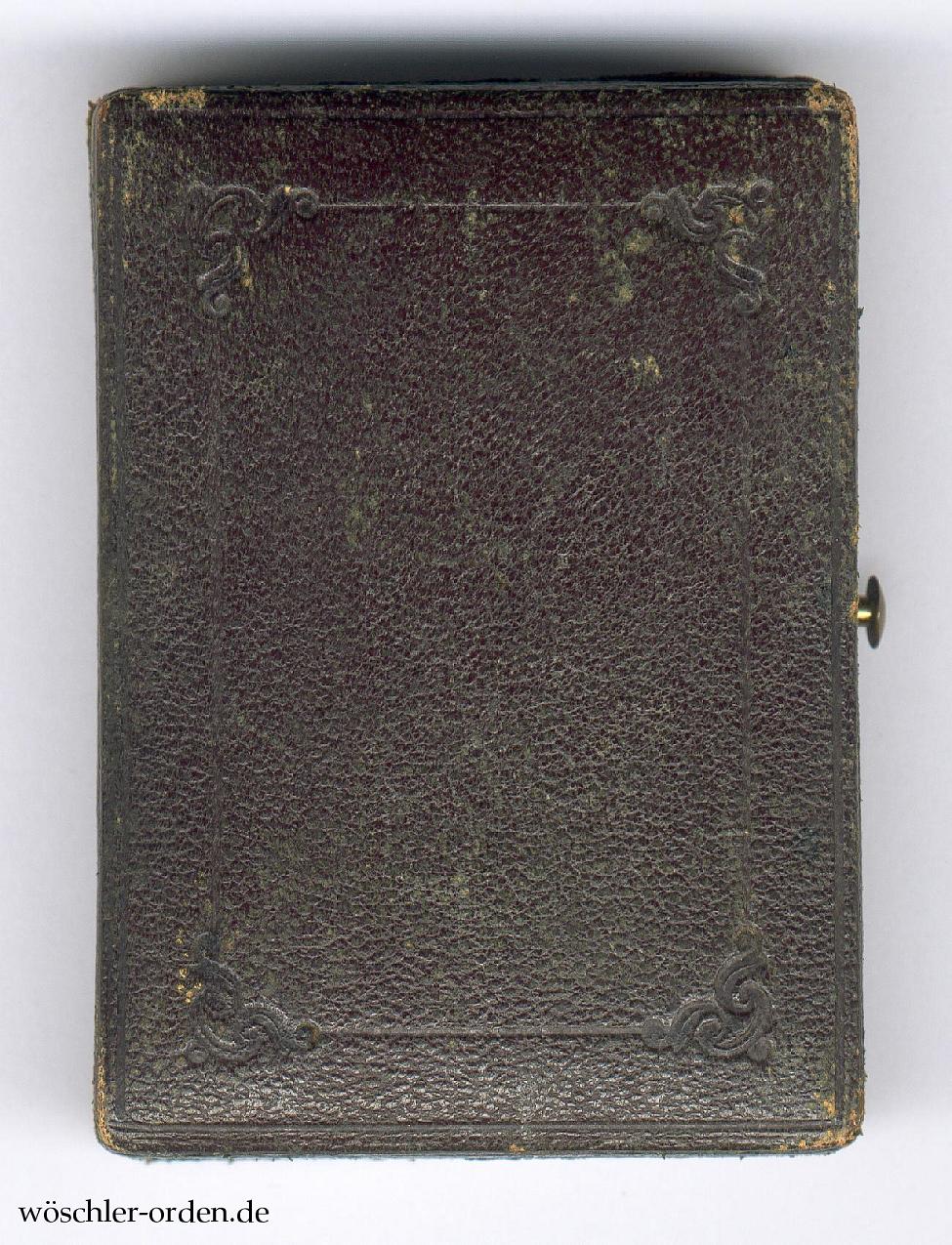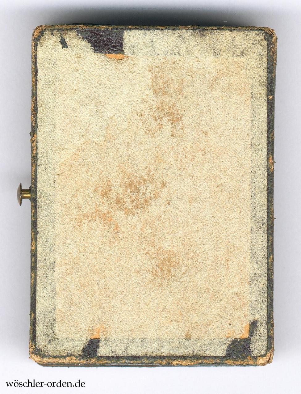 Dazu das wohl zugehörige Verleihungsetui aus Fertigung des Hofbuchbinders H. F. Schwartz, Berlin, bezogen in dunkelgrünem Leder mit eingeprägtem Dekor auf dem Deckel, innen mit altweißer Seidenverkleidung des Deckels und violetter Samteinlage mit Aussparung für das Kreuz, sowie mit den typischen goldenen Zierleisten.