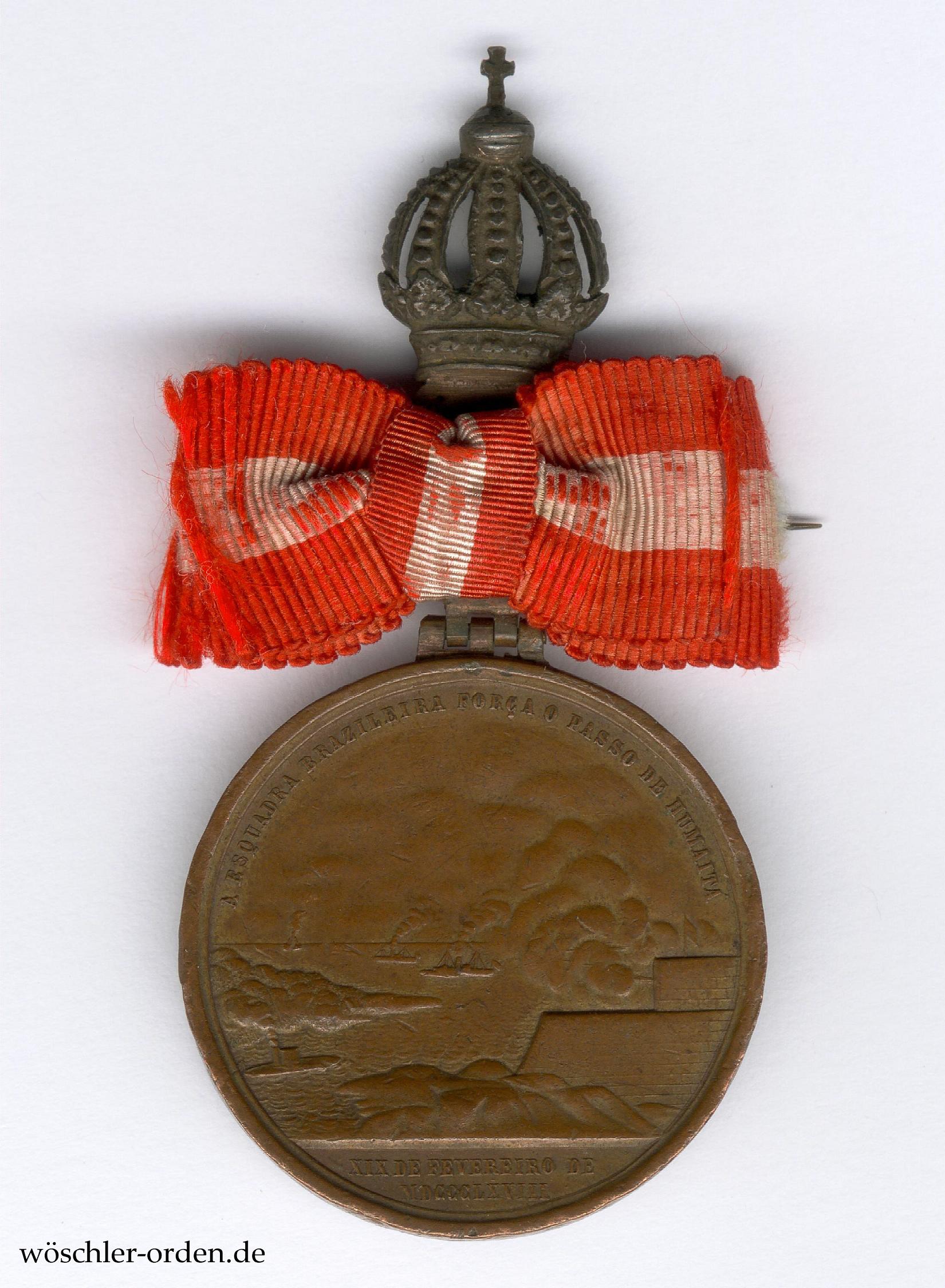 Bronze geprägt und patiniert, über ein Scharnier mit einer Tragevorrichtung versehen, auf die das zu einer Schleife konfektionierte Band aufgenäht ist, und die von einer halbplastischen brasilianischen Kaiserkrone überhöht ist. Vorderseitig mit Darstellung der Passage der brasilianischen Flotte auf dem Fluss Paraguay, unter Beschuss der Kanonen der Festung Humaitá, mit Umschrift „A ESQUADRA BRAZILEIRA FORCA O PASSO DE HUMAITÁ“. Unten das zweizeilige Datum „19 DE FEVEREIO DE / MDCCCLXVIII“. Rückseitig fünfzeilige Inschrift „AOS / DA / PASSAGEM / DE / HUMAITÁ“ in einem dichten Lorbeerkranz.