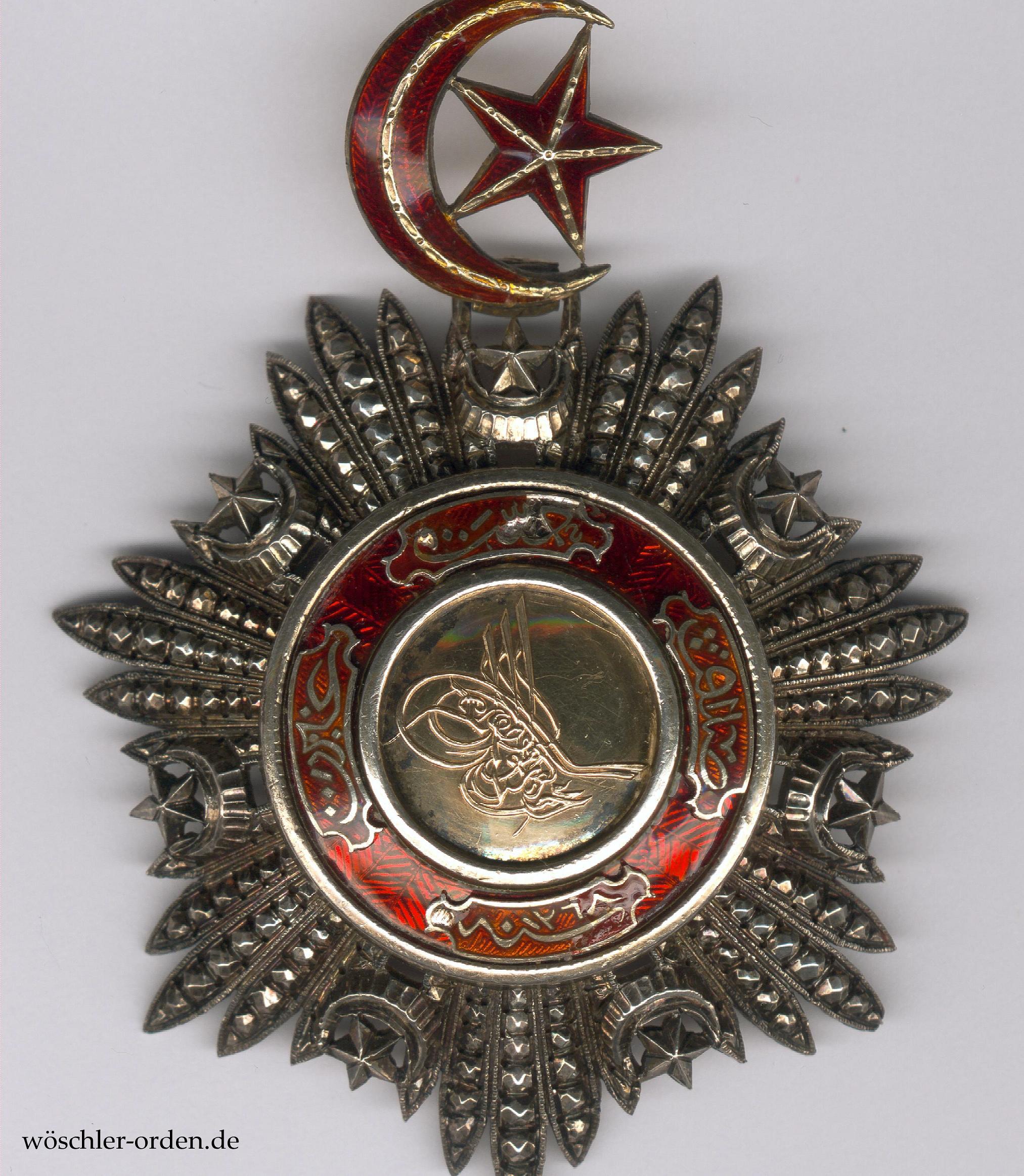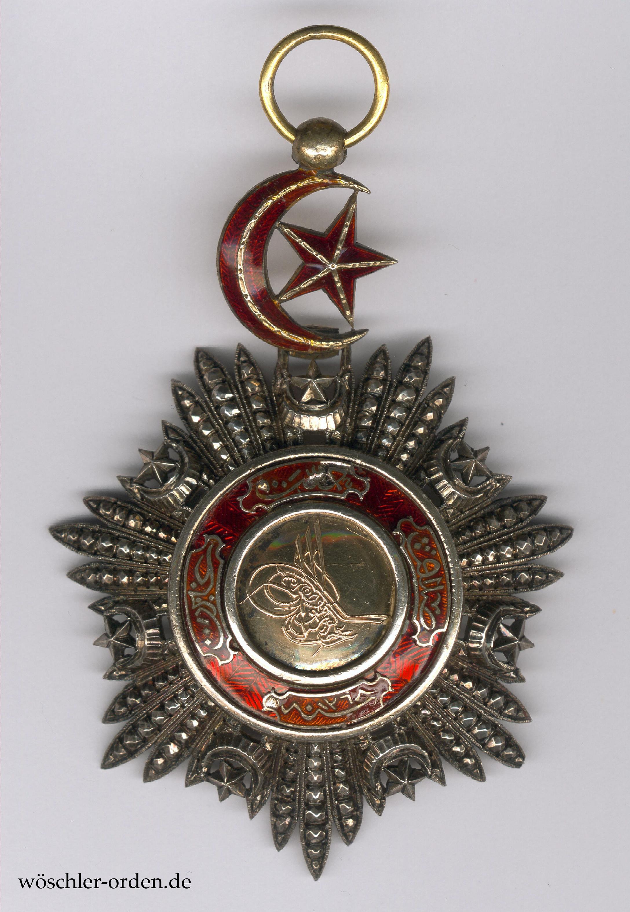 Der Mecidiye-Orden wurde als fünfklassiger Zivil- und Militär-Verdienstorden im August 1852 durch den osmanischen Sultan Abdül-Mejid I. (1823–1861) gestiftet. Wohl im Verlauf des Ersten Weltkrieges wurde die Verleihung aller Klassen mit gekreuzten Säbeln eingeführt. Als besondere Auszeichnung wurde die 1. Klasse mit Steinen besetzt verliehen, wobei die Insignien nahezu vollständig mit Brillanten und/oder Diamantrosen besetzt waren. Nach Ausrufung der Republik wurde der Orden, wie alle osmanischen Auszeichnungen, 1922 aufgehoben.