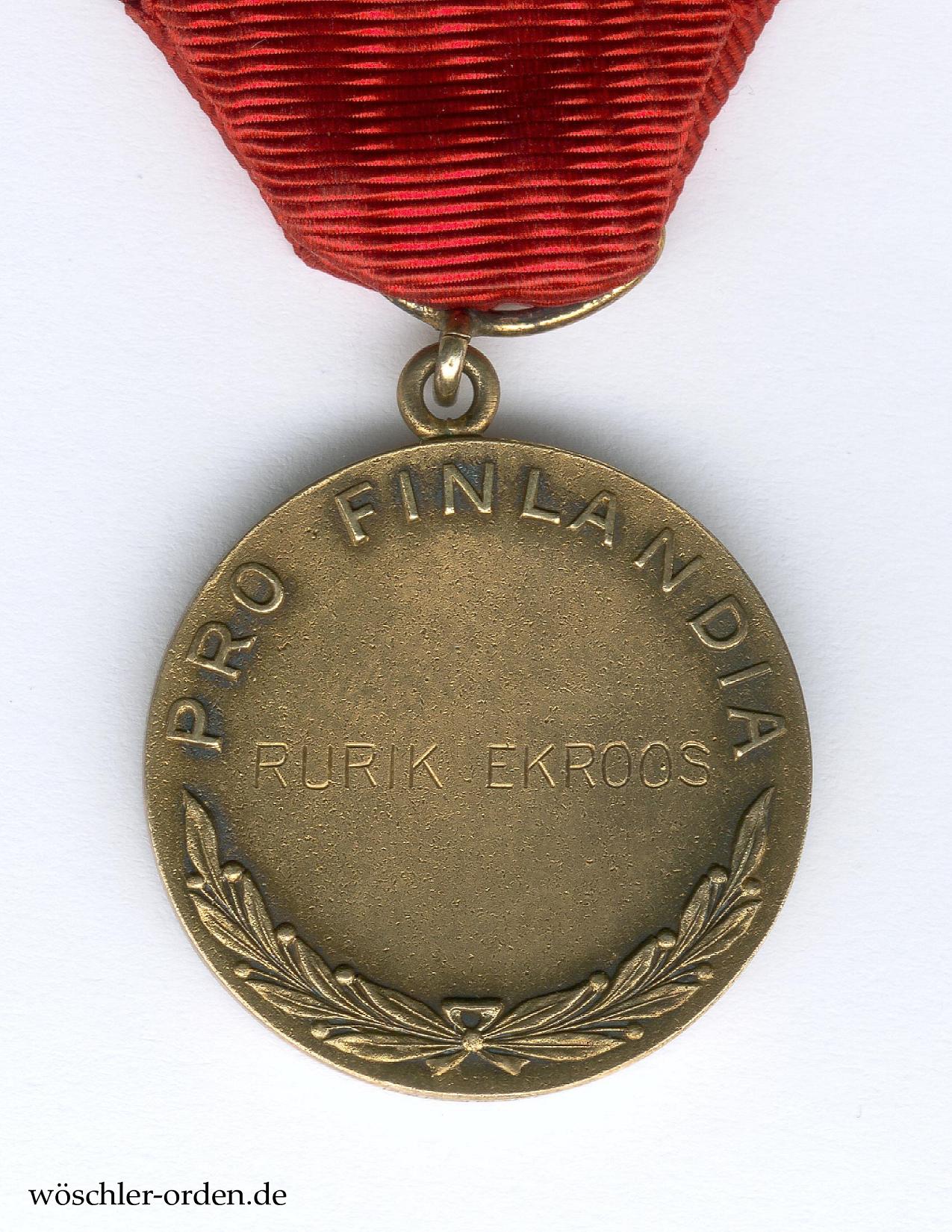 Rurik Ekroos (1902–1977) war ein finnischer Theater-, Film- und Fernseh-Schauspieler. Er wirkte ab 1924 u. a. in drei Stummfilmen und ab 1932 in zwei Tonfilmen (u. a. in „General von Döbeln“) mit, und ab 1962 in einer ganzen Reihe finnischer Fernsehfilme. 1954 zeichnete ihn der finnische Präsident Juho Kusti Paasikivi (1870–1956, Präsident seit 1946) mit dieser Medaille aus.