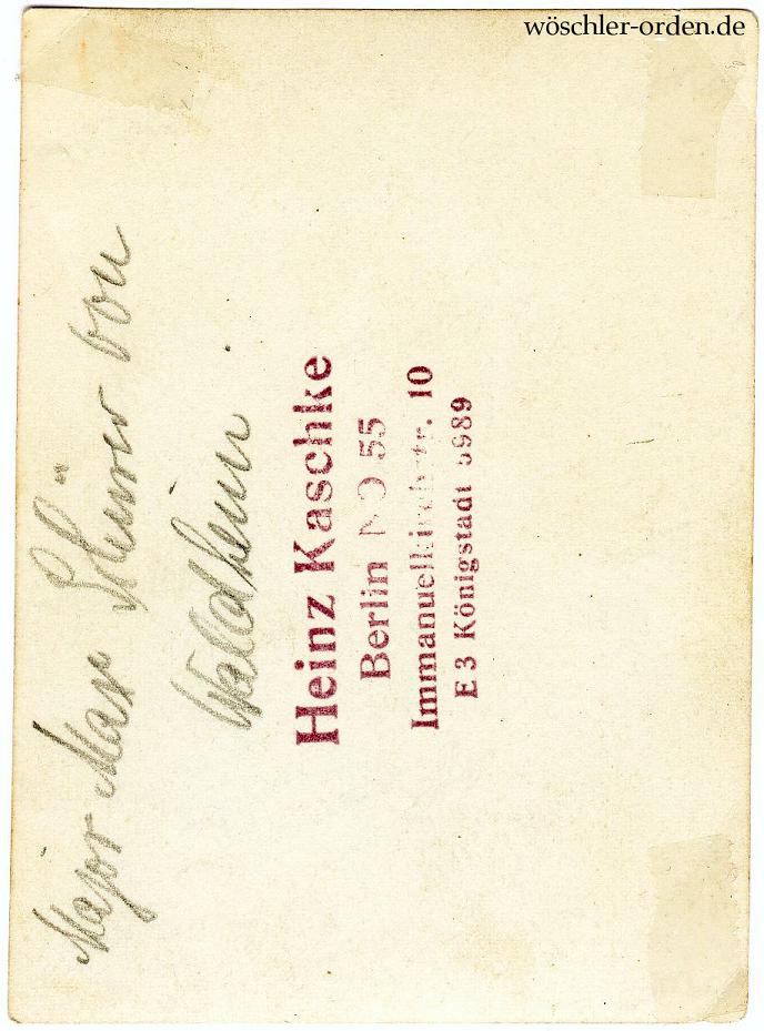 Aufnahme von – laut rückseitigem Stempel – Heinz Kaschke, Berlin, wohl aus den 1920er- bis 1930er-Jahren. Gesamtformat etwa 10,5 cm x 7,5 cm, davon Bildgröße etwa 7,5 cm x 5,5 cm. Außerdem rückseitig handschriftliche, zweizeilig Angabe „Major Max Schürer von / Waldheim“ in Bleistift.
