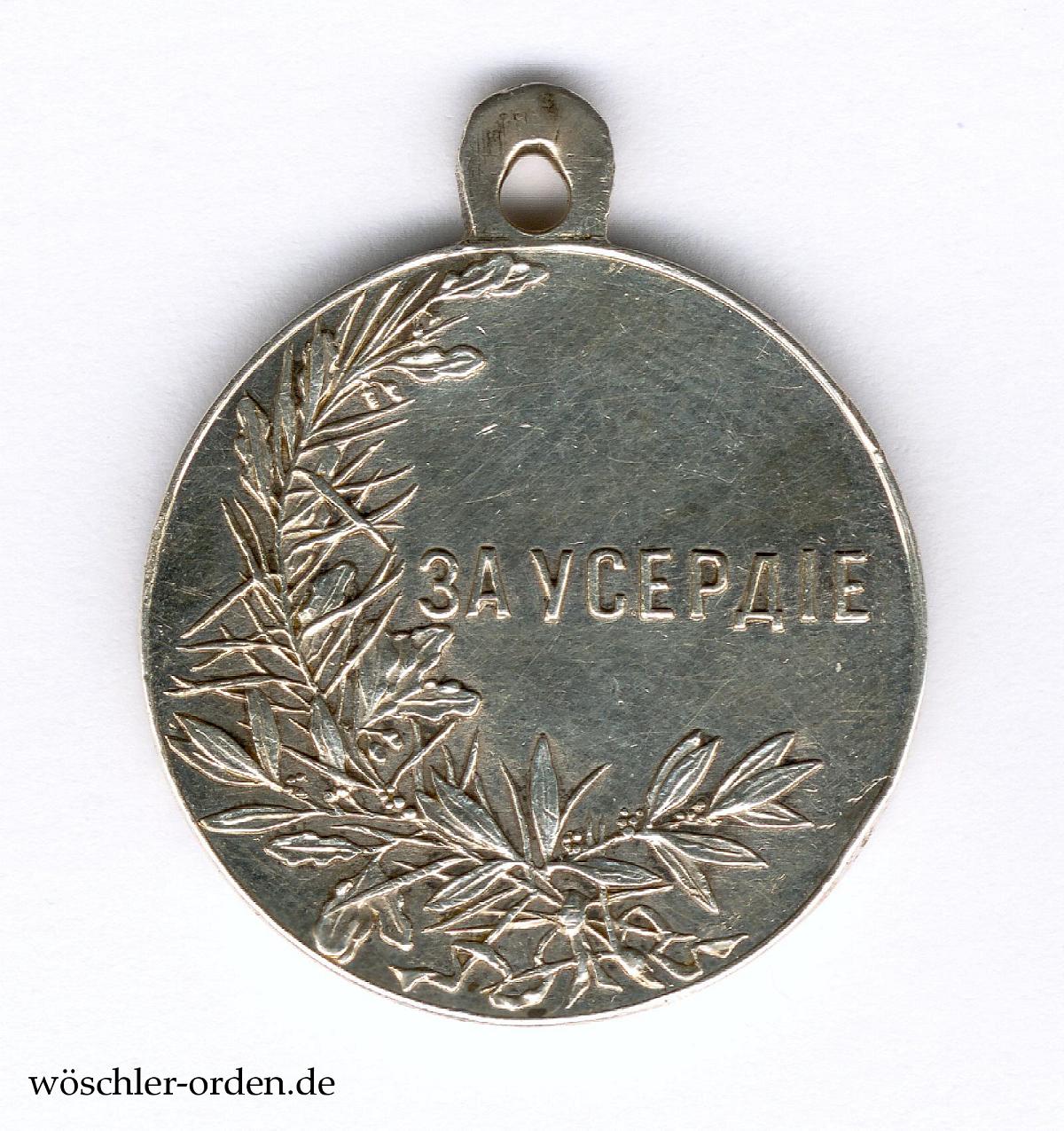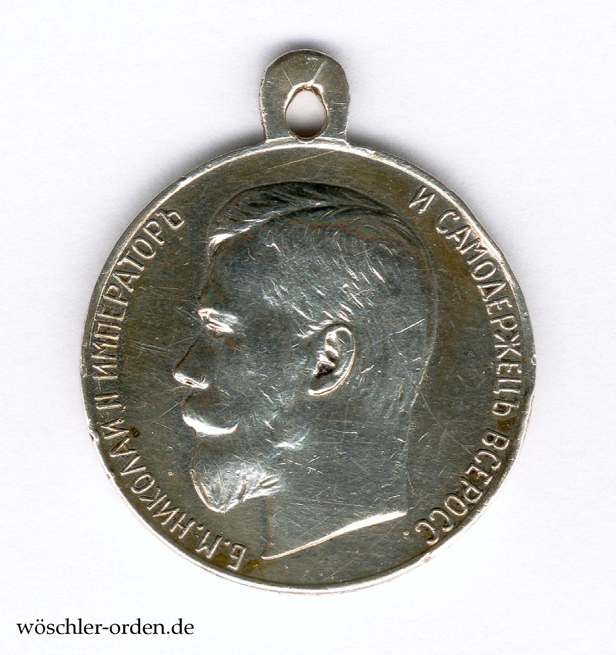 Exemplar der ersten, bis 1916 verliehenen „echten“ Ausgabe des fünften, von 1894 bis 1917 verliehenen Modells mit dem Portrait des Zaren Nikolaus II. Silber geprägt, etwa 30 mm, an angeprägter, gelochter Parallelöse.
