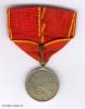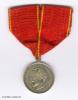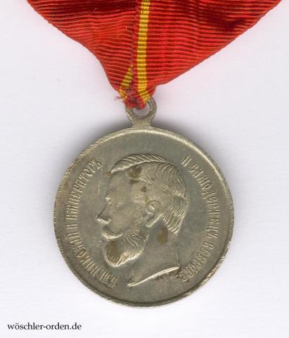 Exemplar der zweiten, 1916/17 verliehenen „unechten“ Ausgabe des fünften, von 1894 bis 1917 verliehenen Modells mit dem Portrait des Zaren Nikolaus II. Buntmetall geprägt und versilbert, etwa 28,5 mm, an angeprägter, gelochter Parallelöse mit länglichem, aus Draht gebogenem Bandring.