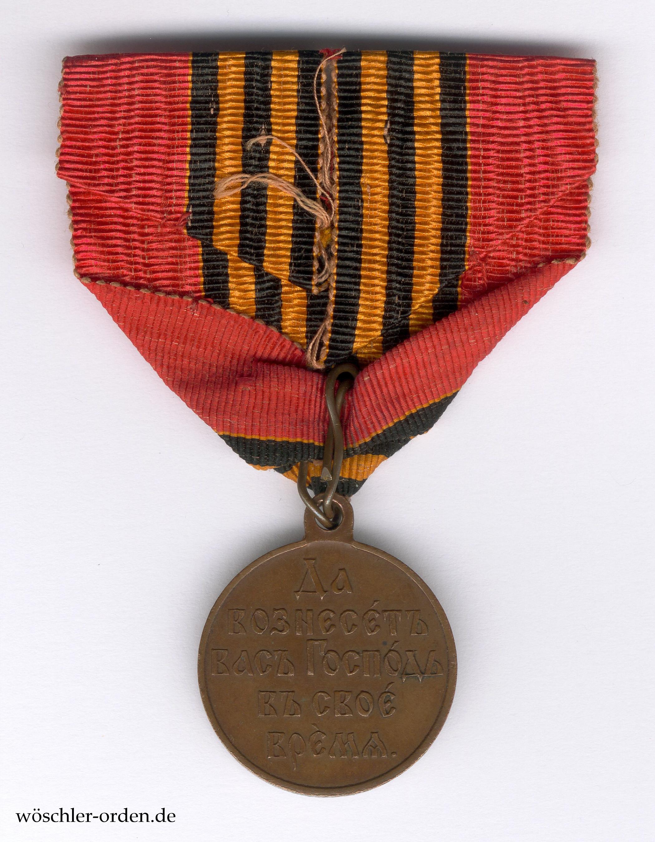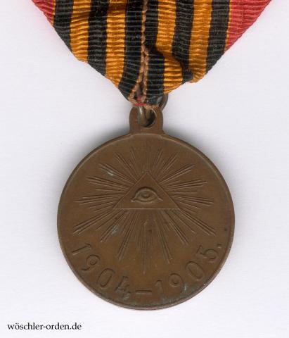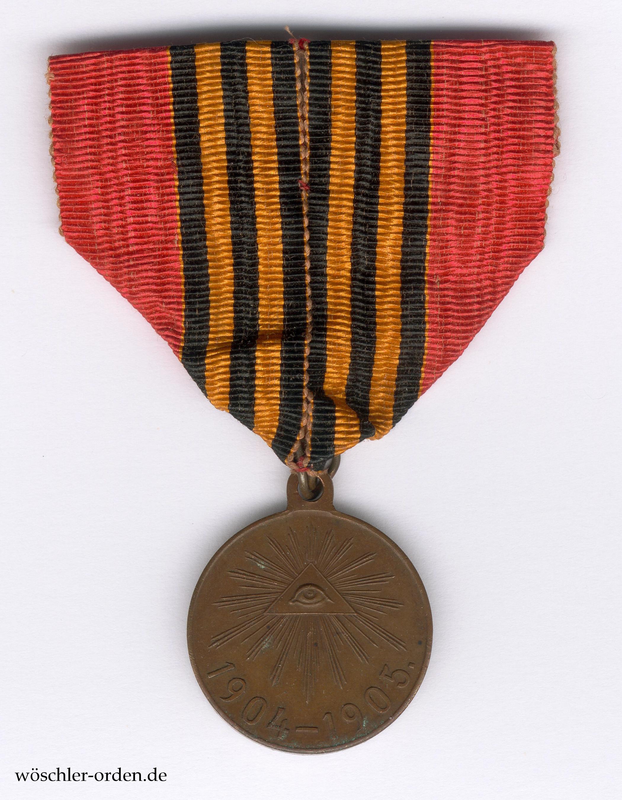Der Russisch-Japanische Krieg begann im Februar 1904 mit dem Angriff des Japanischen Kaiserreichs auf den Hafen von Port Arthur und endete nach einer Reihe verlustreicher Schlachten im Sommer 1905 mit der Niederlage des Russischen Kaiserreichs. Der unter US-amerikanischer Vermittlung ausgehandelte Friedensvertrag von Portsmouth vom 5. September 1905 besiegelte den ersten bedeutsamen Sieg einer asiatischen über eine europäische Großmacht in der Moderne. Im Anschluss stiftete Zar Nikolaus II. am 21. Januar 1906 diese Medaille in drei verschiedenen Ausgaben, nämlich Bronze, Silber und Kupfer.