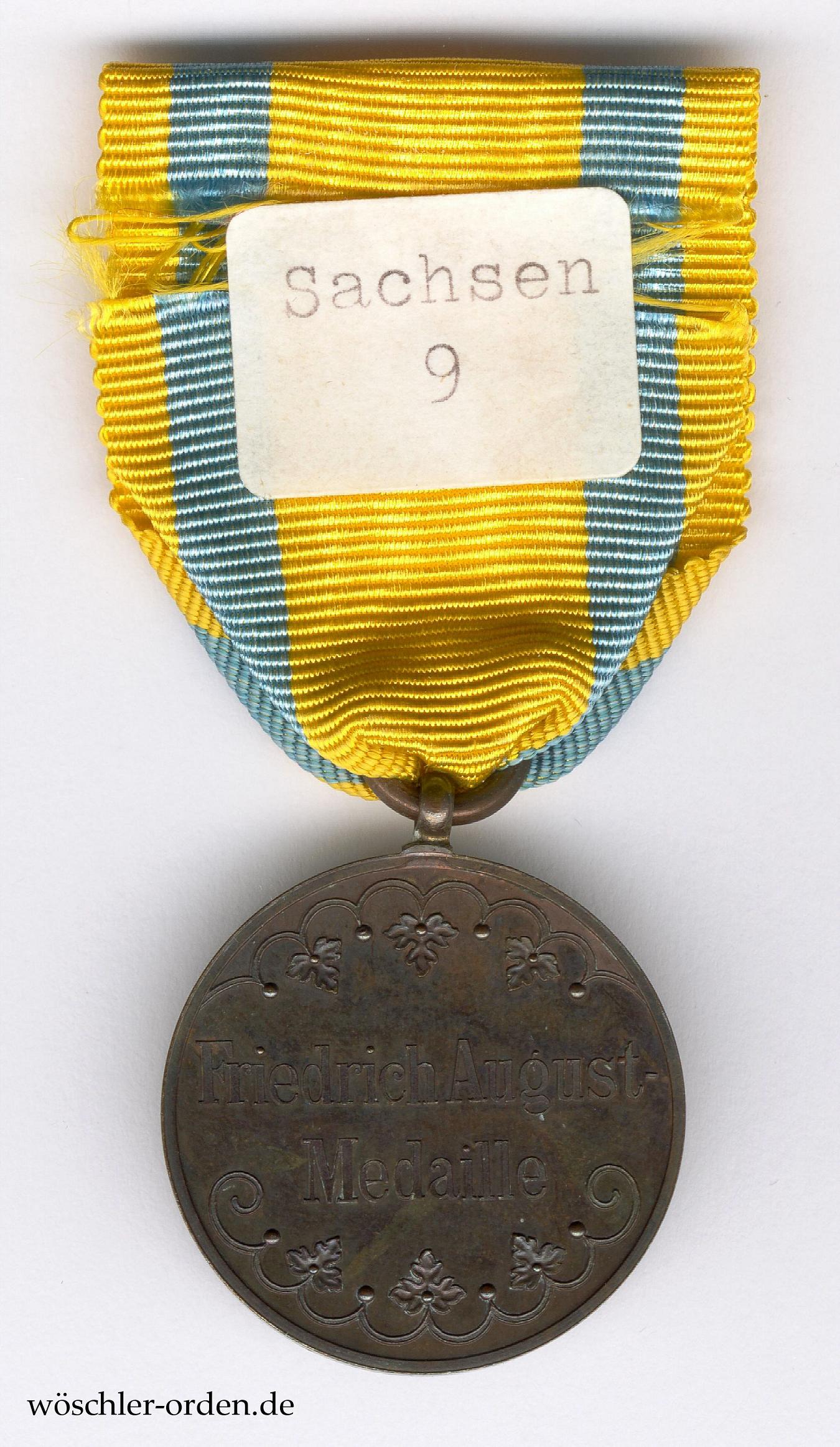 Die Friedrich-August-Medaille wurde durch Friedrich August III. am 23. April 1905 „zur Anerkennung verdienstlicher Leistungen bei Mannschaften vom Feldwebel abwärts und diesen im Range gleichstehenden Zivilpersonen in Krieg und Frieden“ in zwei Klassen, Bronze und Silber, gestiftet. Für Kriegsverdienste wurde sie an einem gelben Band mit zwei blauen Streifen, für Friedensverdienste an einem gelben Band mit drei schwarzen Streifen getragen. Ab 8. April 1910 waren Verleihungen auch an Frauen möglich. Im Weltkrieg wurde sie zu der sächsischen Massenauszeichnung schlechthin.