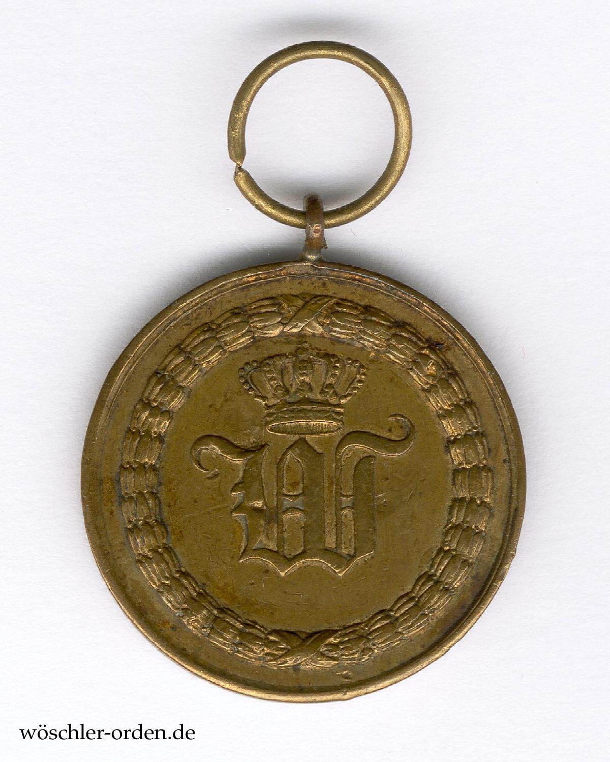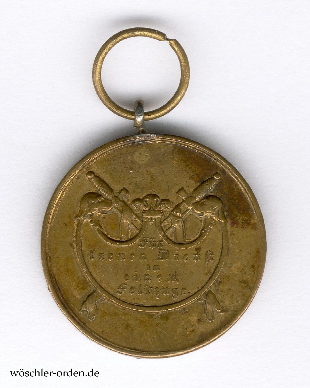 Ausgabe „Für treuen Dienst in einem Feldzuge“. Bronze geprägt, an angelöteter, einfacher Ringöse aus dünnem Draht mit einem offenem, ebenfalls dünnem Bandring. Exemplar mit, nach Klein und Raff, Stempelkopplung „1/1“, also der unsignierten Vorderseite und der Rückseite mit der kleineren Schrift.