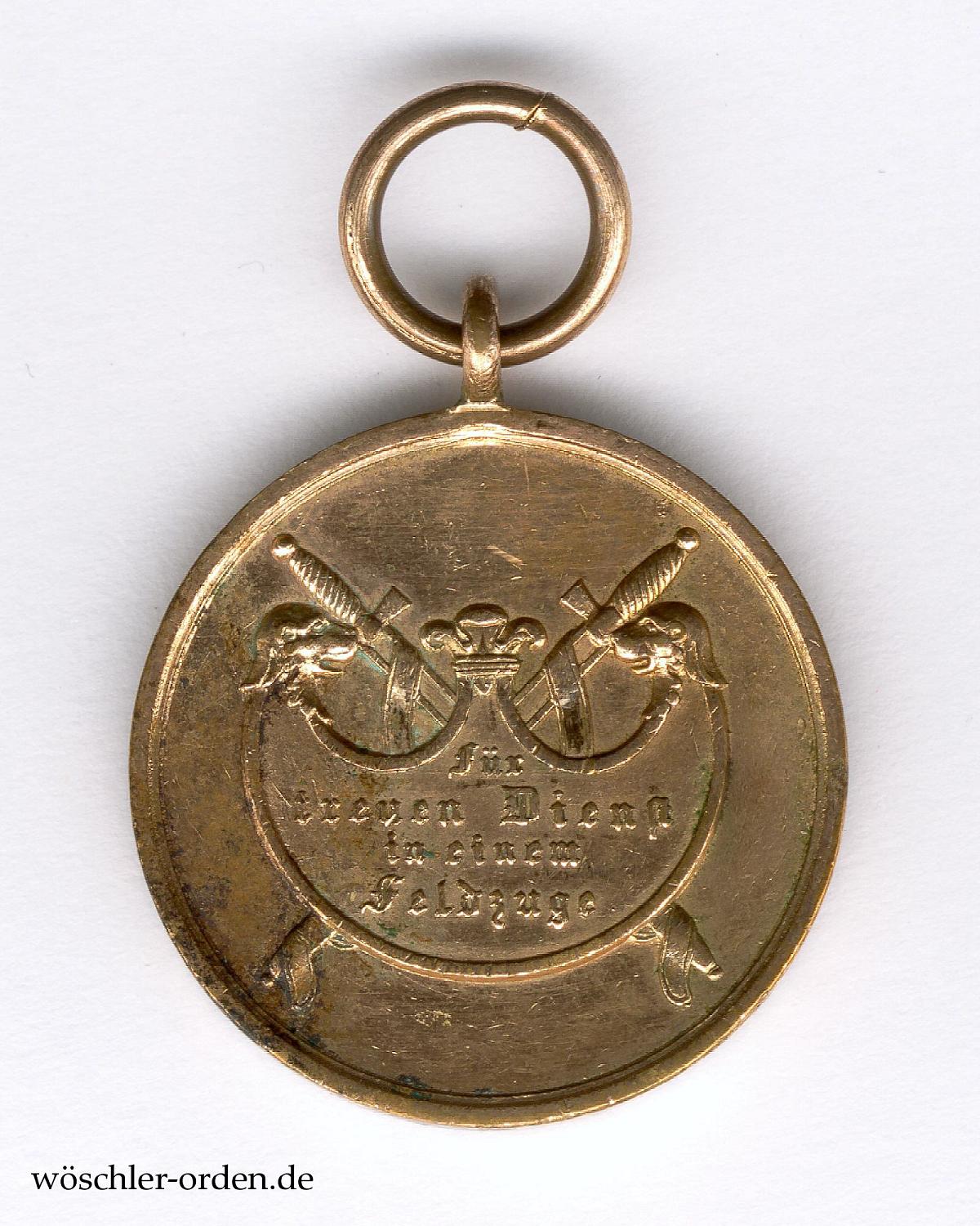 Standardausgabe „Für treuen Dienst in einem Feldzuge“. Bronze geprägt, an angelöteter Ringöse mit offenem Bandring.