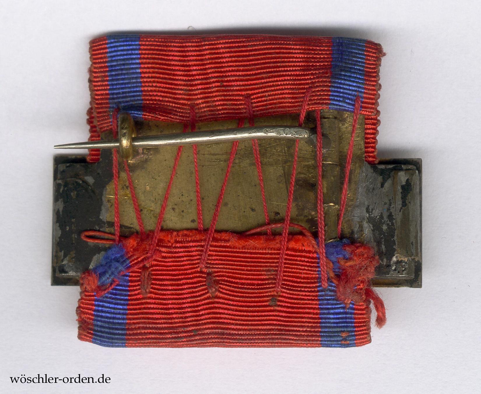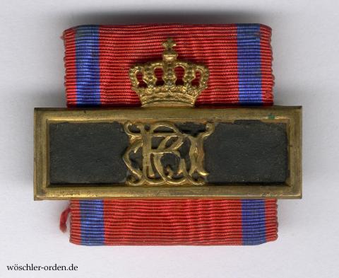 Exemplar des zweiten, unter König Wilhelm II. ab 1892 verliehenen Modells. Geschwärzte Eisenplatte in vergoldetem Silberrahmen mit dem Monogramm „WR“ für Wilhelm II. und Krone, auf Messingblech mit Tragenadel montiert.