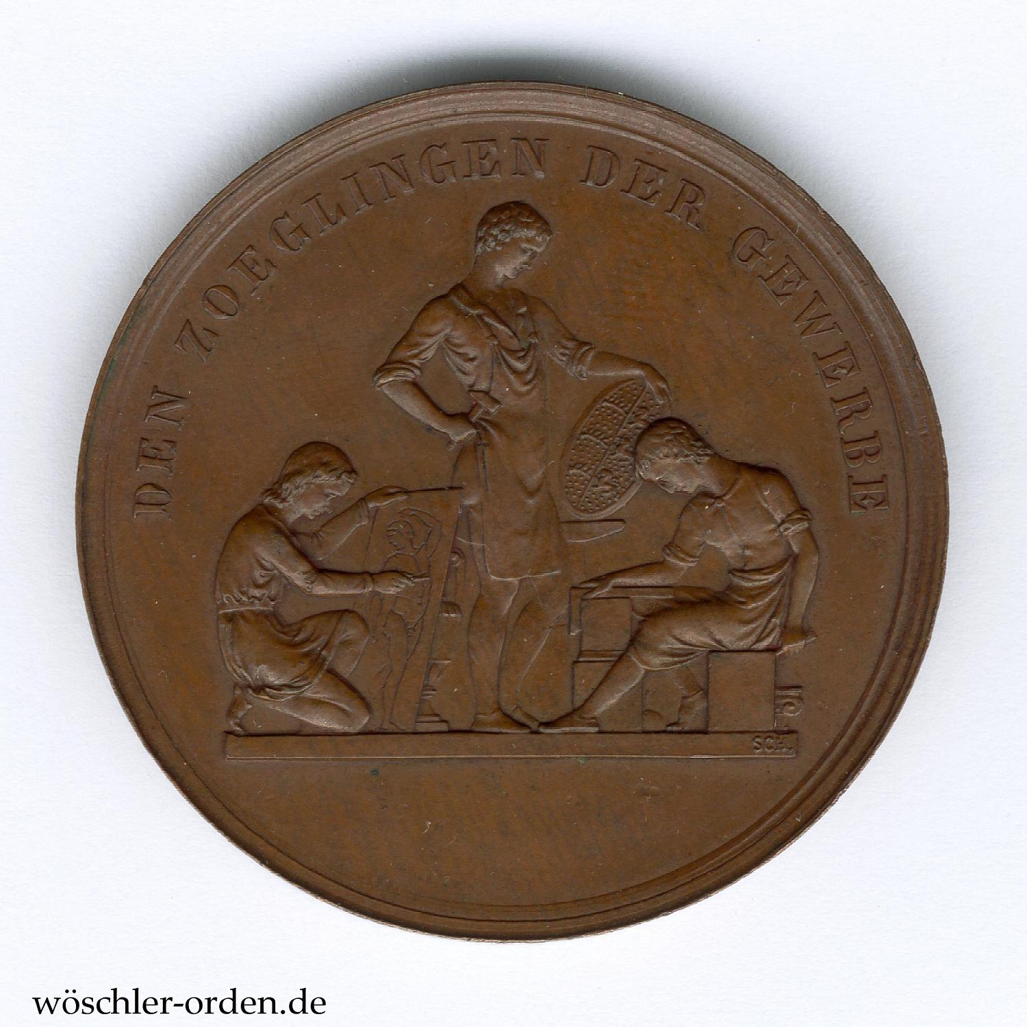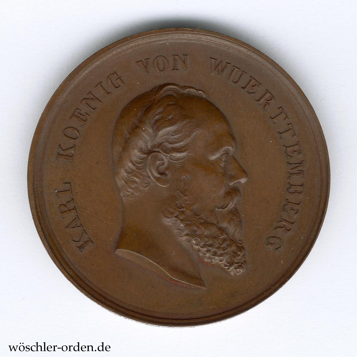 Bronze, etwa 43 mm. Vorderseitig Portrait des Königs Karl nach rechts, Umschrift „KARL KOENIG VON WUERTTEMBERG“. Rückseitig ein stehender junger Mann, nach rechts gewandt und mit einem Schurz bekleidet, der in der Rechten einen Hammer und in der Linken einen auf einen Amboss gestellten württembergischen Wappenschild hält. Er ist von zwei weiteren Zöglingen flankiert, der eine links kniend und auf einer Tafel zeichnend, der andere rechts auf einem Quaderstein sitzend, Winkelmaß und Meißel in den Händen haltend.