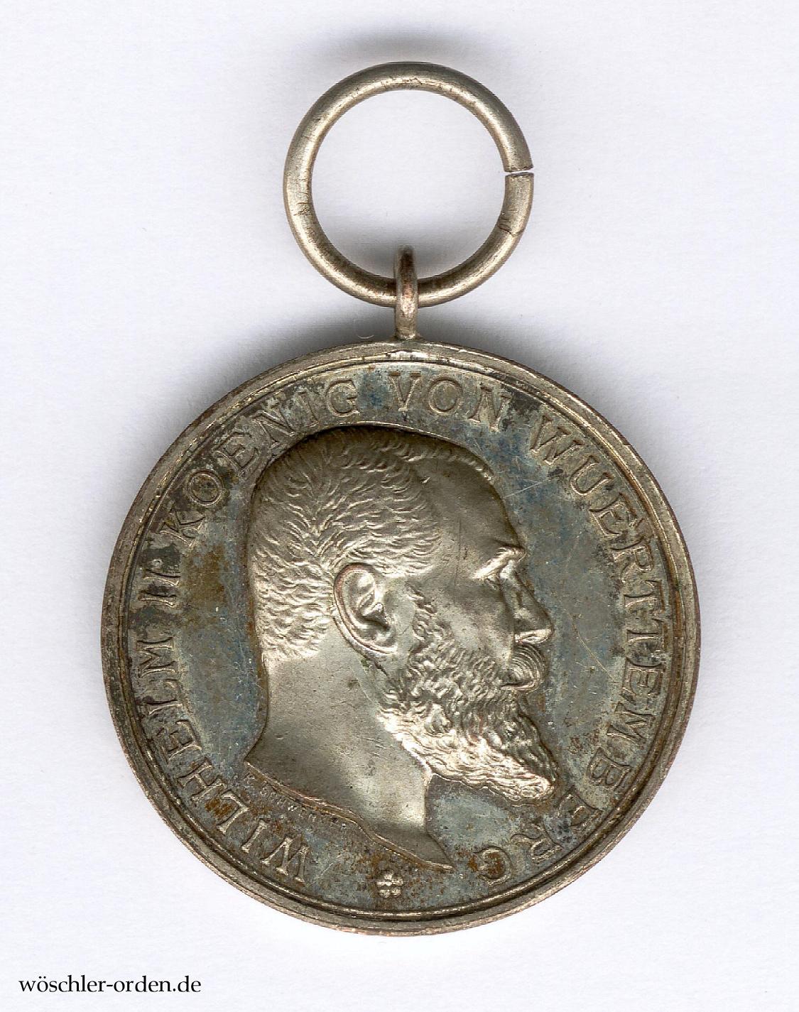 Silberne und Goldene Militärverdienstmedaillen gab es in Württemberg bereits unter Herzog Ludwig Eugen. Unter König Wilhelm II. wurden dann, überwiegend an württembergische Mannschafts- und Unteroffiziers-Dienstgrade, über 200.000 Silberne Medaillen verliehen, für die „Expedition gegen China“ und an in Südwestafrika eingesetzte Soldaten, hauptsächlich aber für den Weltkrieg. Wegen kriegsbedingten Materialmangels musste der Feingehalt auch der silbernen Medaillen sukzessive herabgesetzt werden, von ursprünglich 993/000 über 800/000 und 500/000 schließlich auf 250/000. Die in zumindest acht Varianten vorkommenden Zweitstücke sind naturgemäß merklich seltener zu finden.