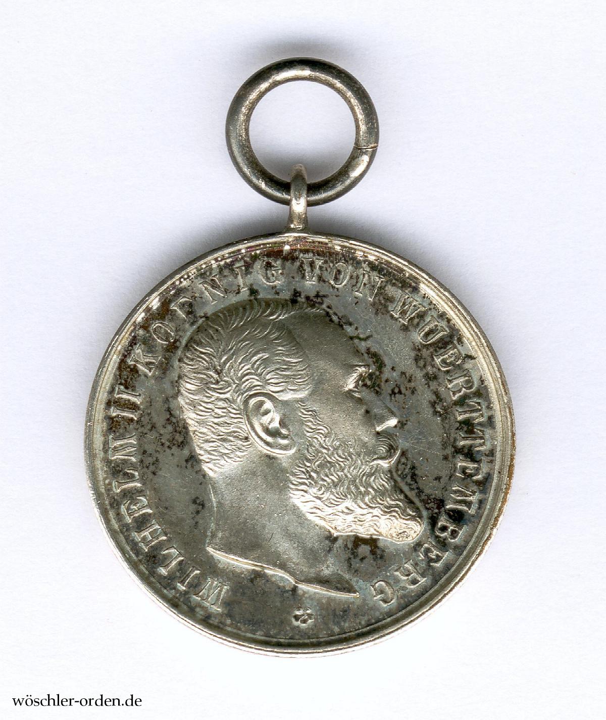 Silberne und Goldene Militärverdienstmedaillen gab es in Württemberg bereits unter Herzog Ludwig Eugen. Unter König Wilhelm II. wurden über 200.000 Silberne Medaillen überwiegend an württembergische Mannschafts- und Unteroffiziers-Dienstgrade verliehen, für die „Expedition gegen China“ und an in Südwestafrika eingesetzte Soldaten, hauptsächlich aber für den Weltkrieg. Wegen kriegsbedingten Materialmangels musste der Feingehalt auch der silbernen Medaillen sukzessive herabgesetzt werden, von ursprünglich 993/000 über 800/000 und 500/000 schließlich auf 250/000. Die in zumindest acht Varianten vorkommenden Zweitstücke sind naturgemäß merklich seltener zu finden.