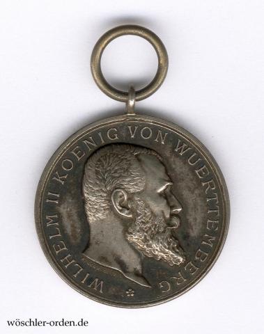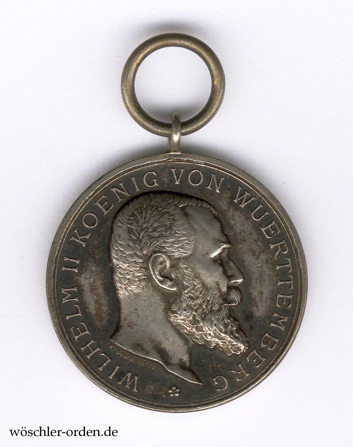 Exemplar des fünften und letzten, unter der endgültigen Bezeichnung verliehenen Modells, mit dem Portrait König Wilhelm II. und der Rückseite mit dem dichten Eichenlaubkranz. Silber geprägt, an angelöteter Ringöse mit offenem Bandring. Insgesamt wurden in dem Stuttgarter Münzamt 10.717 Medaillen geprägt, davon 8050 im Feingehalt 993/000.