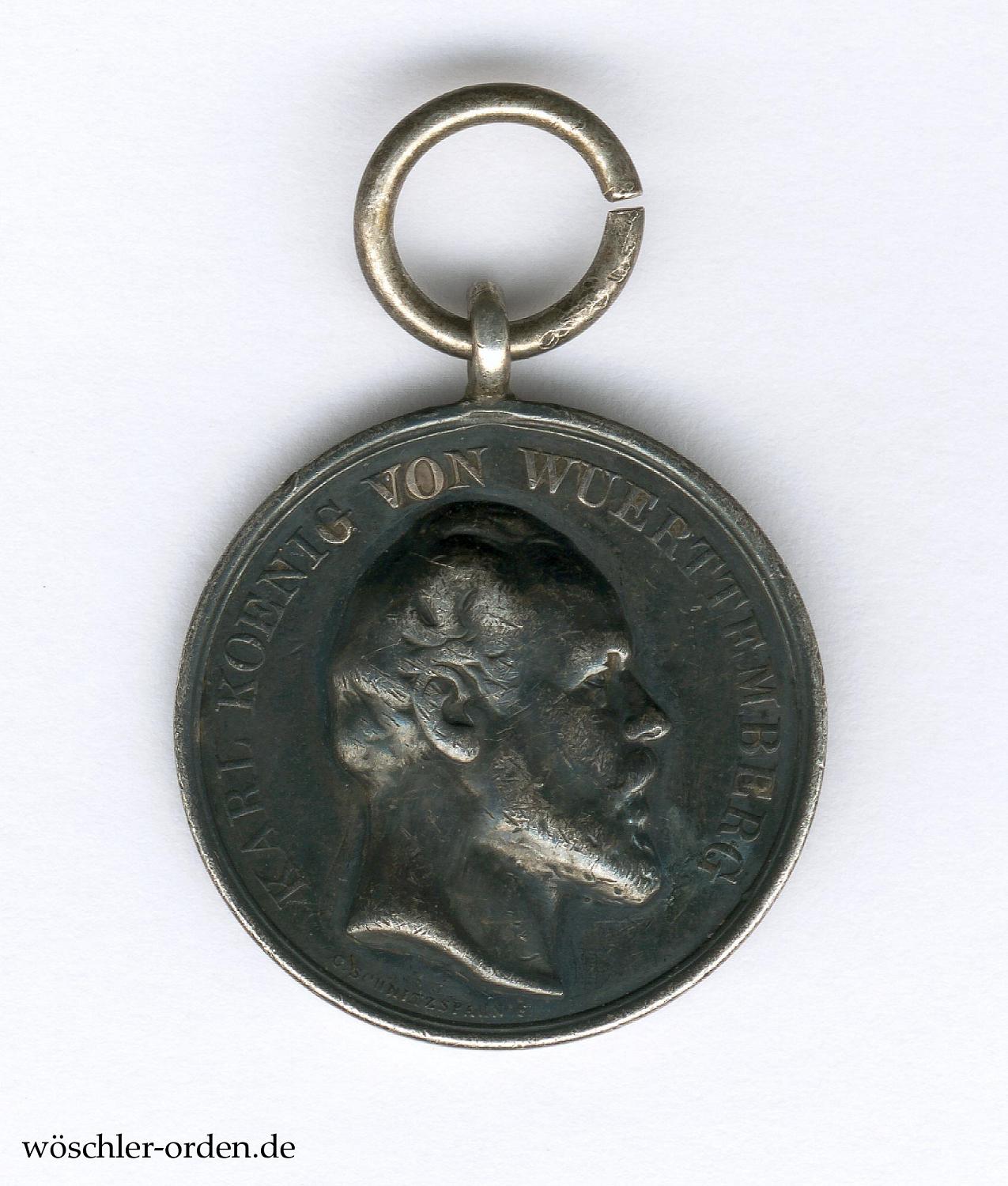 Exemplar des Modells mit dem Portrait König Karls, als erster Typ mit der Signatur des Stempelschneiders Christian Schnitzspahn, so verliehen 1865 bis 1879. Silber geprägt, 28 mm, an kleiner Ringöse mit offenem Bandring.